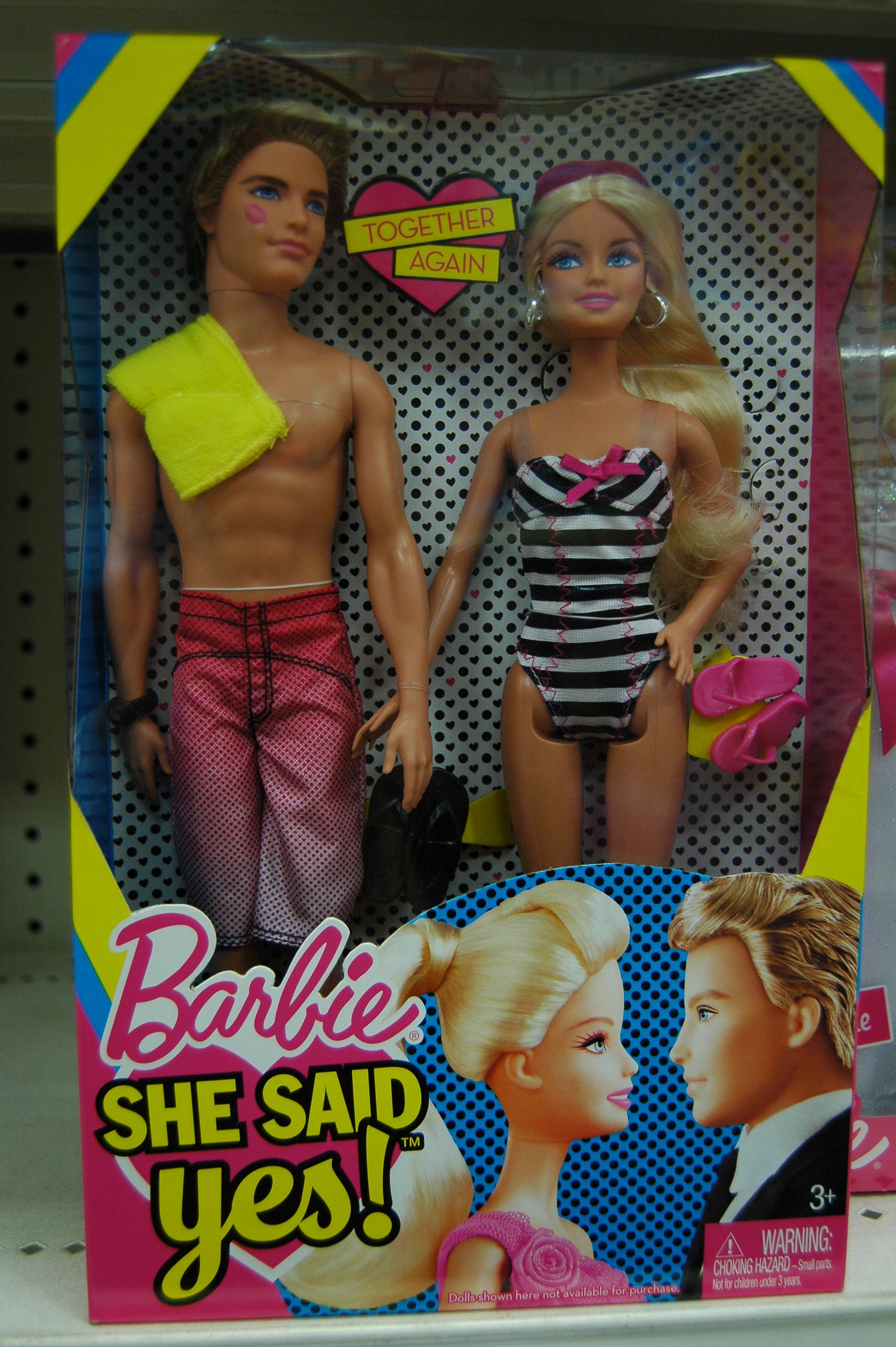 Perhaps todays Ken reflects the more fashion and beauty conscious, dare-I-use-the-most-overused-word-since-2000 ‘metrosexual’ young men of today. Or perhaps he reflects a crisis of masculinity in society lecturers in my gender studies classes swore was happening. Whilst Barbie is off being a doctor or lifesaver or ballerina or bride (she hasn’t quite evolved past the big white dress yet) or whatever she wants to be because dammit, she has the right to choose, Ken gets skinny jeans and a bunch of new poses. I couldn’t help but start to feel sorry for Ken. He seemed so confused- in one box he seemed wittingly  camp with an indeterminate sexual preference, and in another he stood sheepishly next to Barbie, branded with her lipstick on his cheek, ‘Together Again!’.  Purportedly she took him back after dumping him. Barbie holds all the cards, Ken is subject to her whims. Not since the Golliwog have toys been so politically loaded. What next for Ken? Perhaps he will soon be available for purchase with one of those super emasculating baby-holders strapped to his chest. A car with a baby-seat in the back? At least give him a Hummer or something.