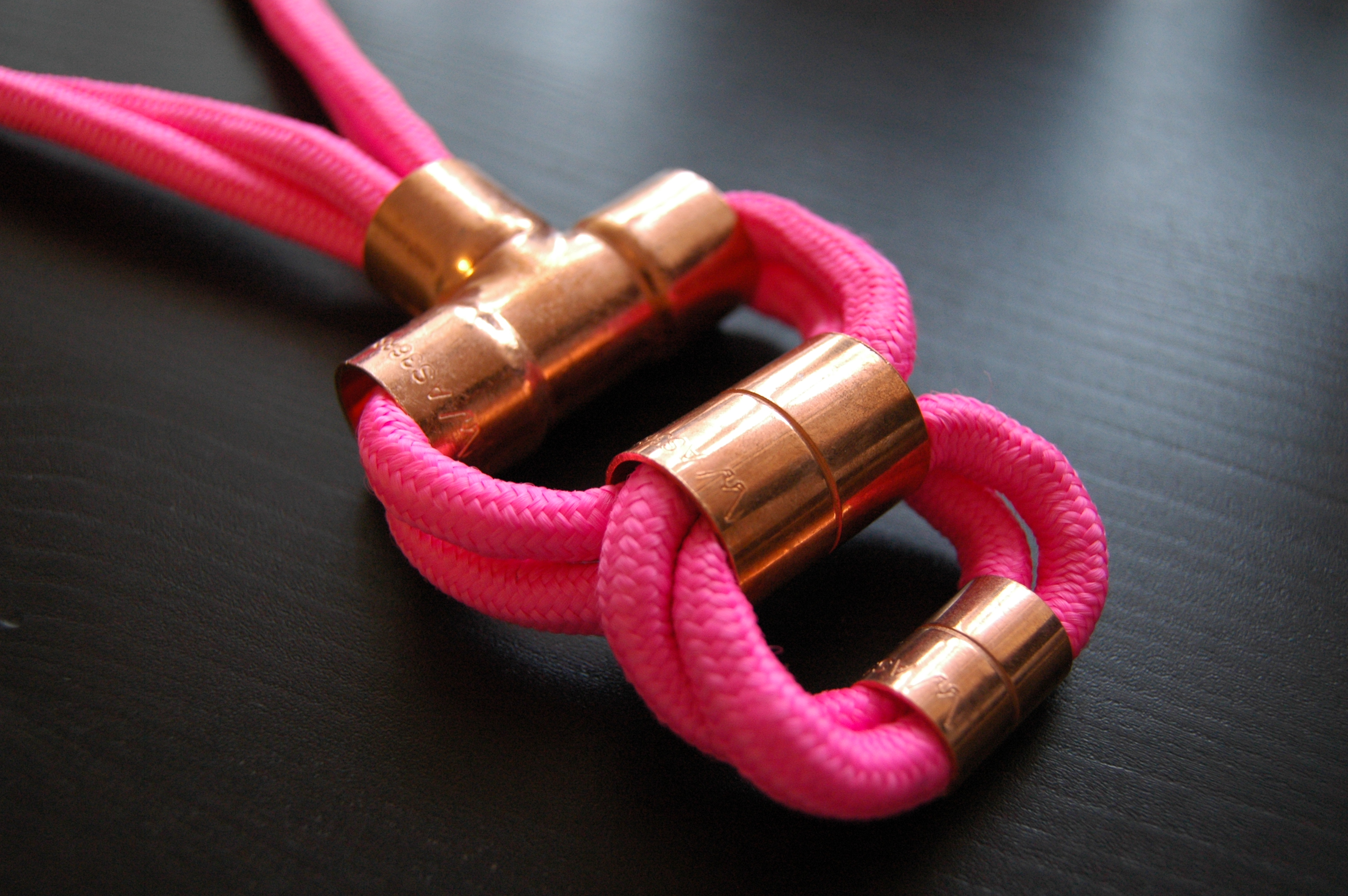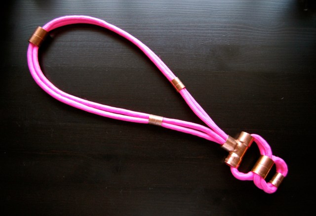 This week I learnt, like so many DIY ladies before me, the wonder and amazement that is the plumbing isle at Bunnings Warehouse. So many pretty shiny tap parts. Pair them with 30m of neon rope and voila! Necklace. This thing took almost zero assembly, just a series of twisting and threading and a tiny bit of glue to join the ends which I covered up with a copper thingy. Now I only have approximately 29 more metres of neon rope to use….