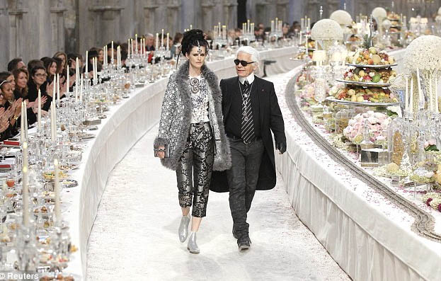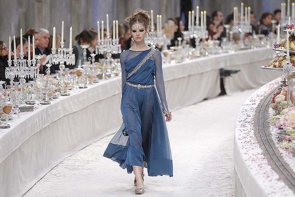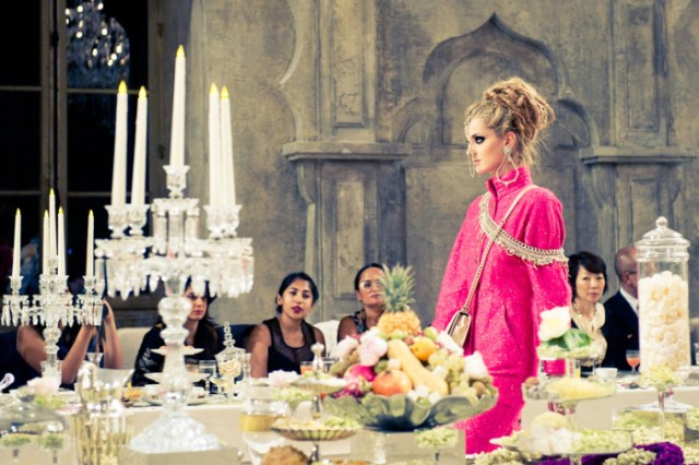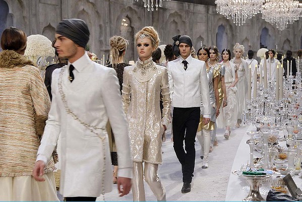 Anyway, when I saw these photos of Karl Lagerfeld’s Paris-Bombay collection for Chanel I couldn’t help but want to share them. Presented at the Grand Palais in Paris last week at a high tea fit for a Maharaja, the collection features sari-wrap dresses, nehru jackets (think Punjab- Daddy Warbucks’ Indian right-hand man in Annie), turbans and pearl collar necklaces.