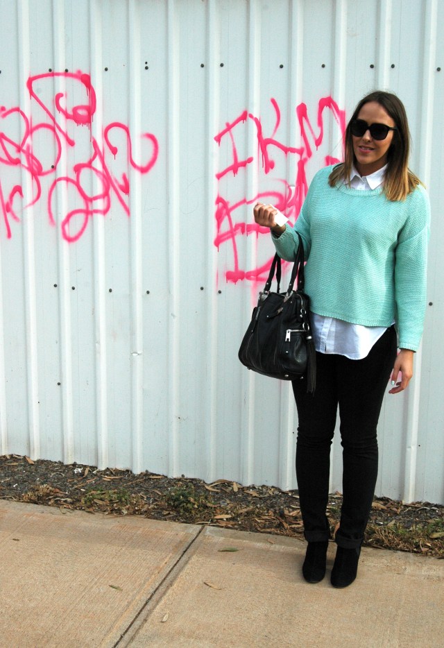 I love seeing mint everywhere at the moment. Such a great colour. Sweater is from Zara. Nail polish is Revlon. Graffiti curtesy of bored teenagers.