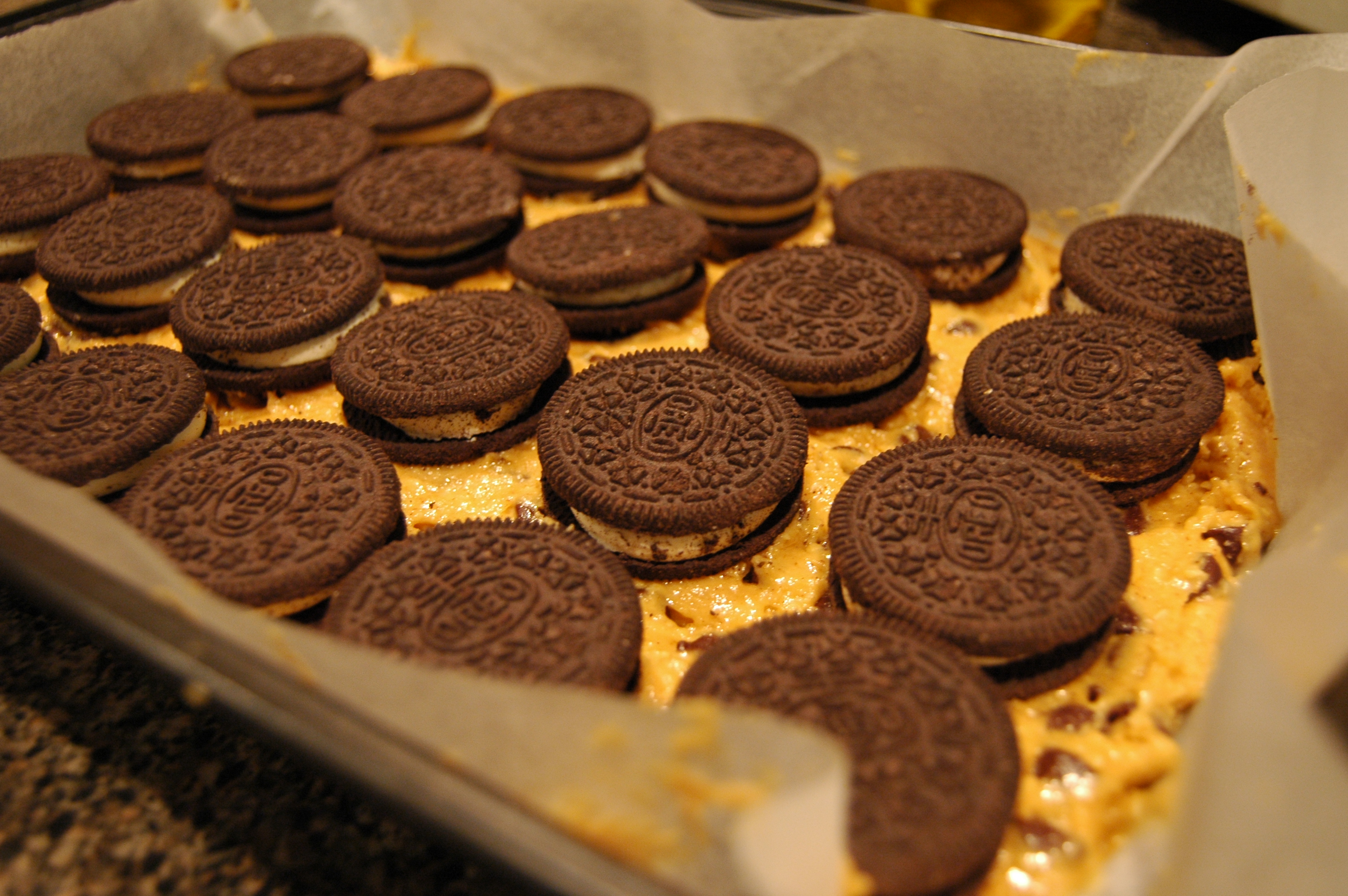 Now cover the cookie dough with the double stuffed Oreos in neat little rows.