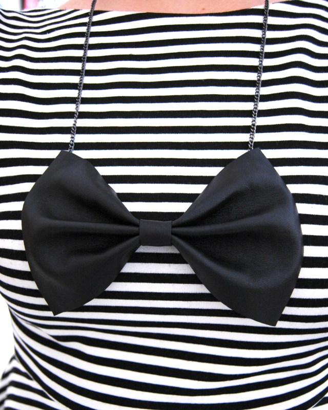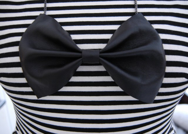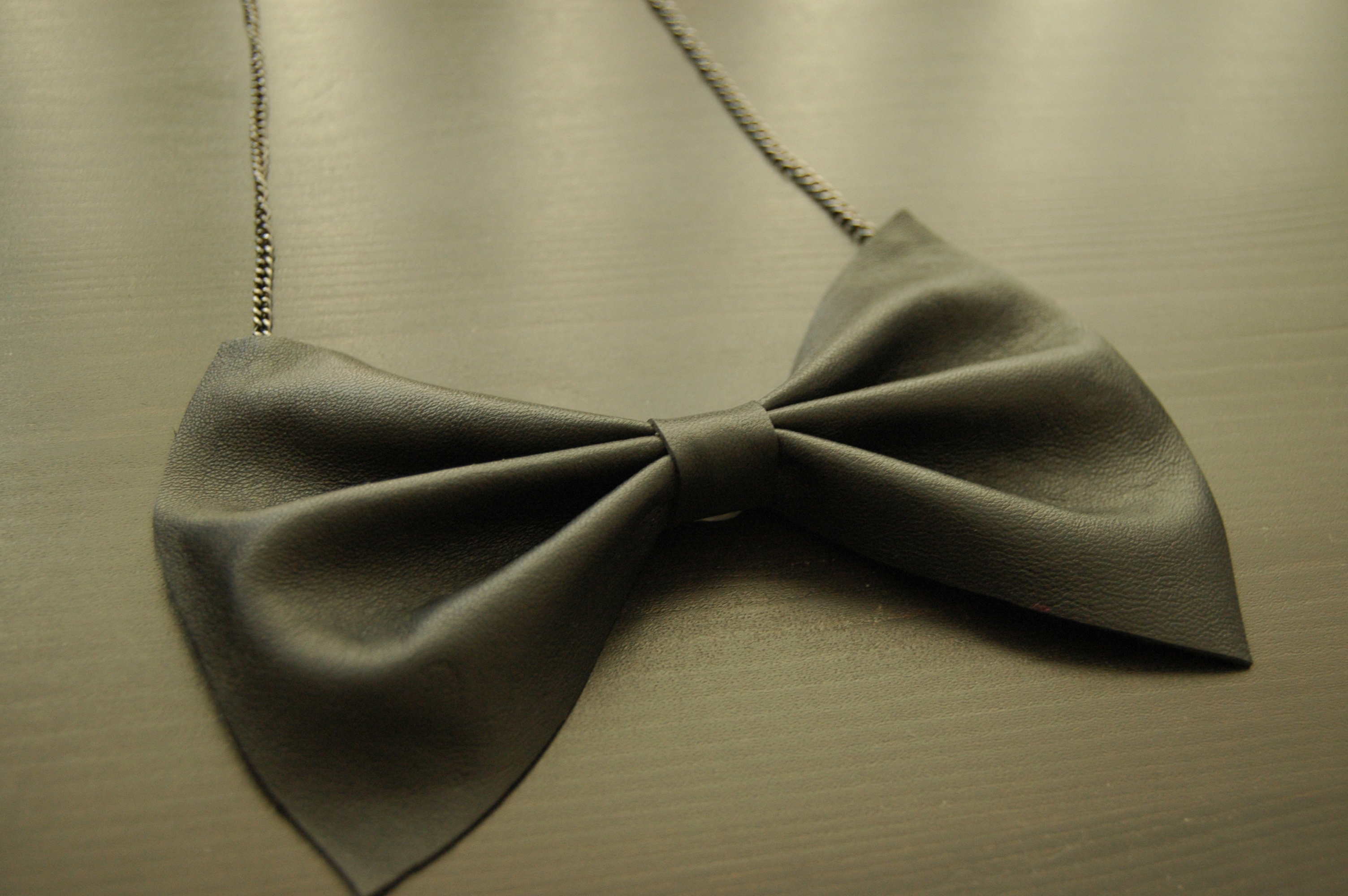 6.Using hot glue, fix the small piece of leather in place. Voila! You now have a bow. At this point you could attach it to a bobby pin, headband or a bangle, but I’m going to add a chain to made a necklace.