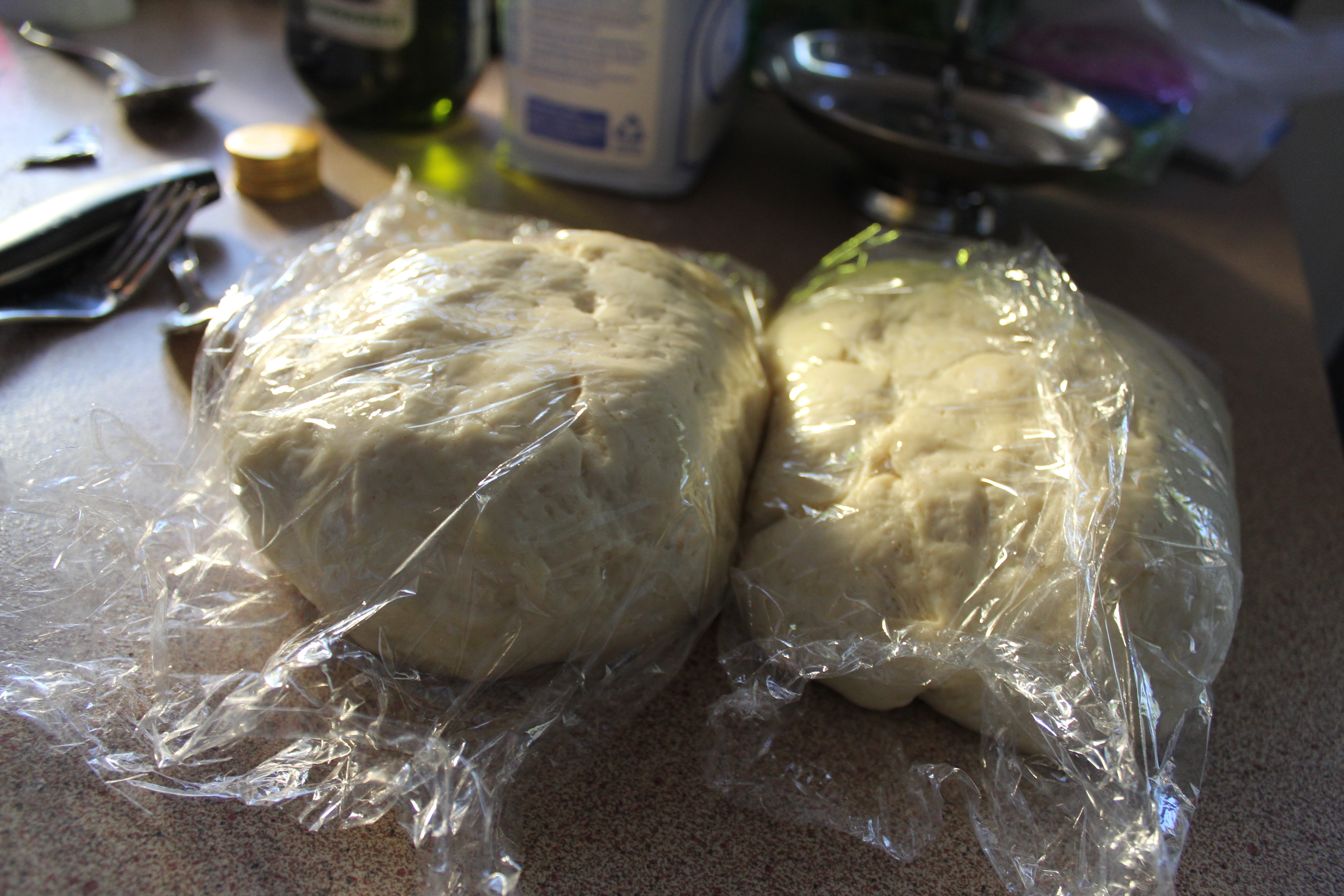Split the dough in half and cover with cling wrap very loosely, so the lumps have room to expand.