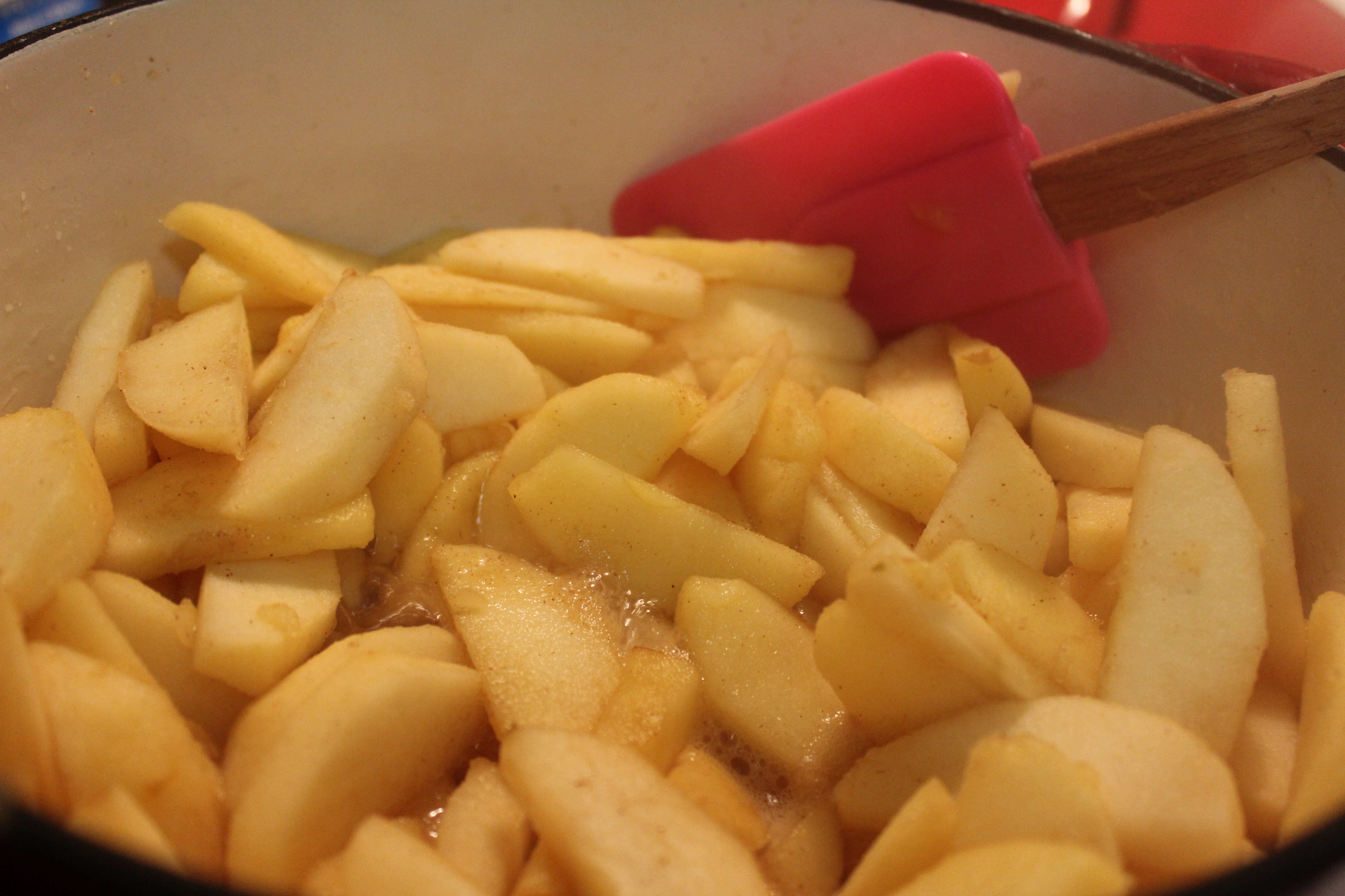 Stew the apples in a pot with a little water, a few shakes of cinnamon, two teaspoons of vanilla essence and a splash of lemon juice. Let the apples soften, but not go mushy.