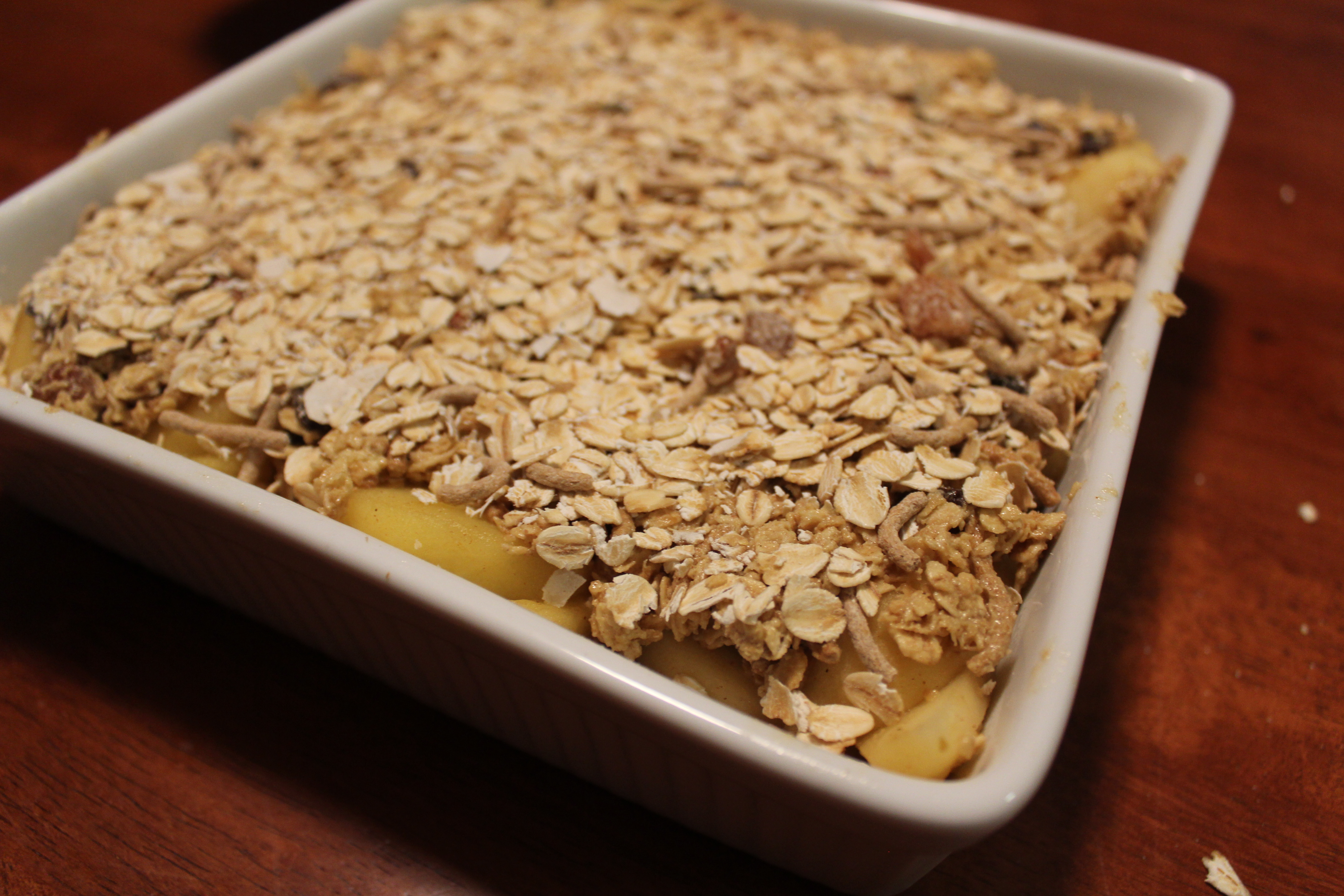 So, my housemates Elly, Bec and I are making an effort to eat a little more healthily at the moment (a project which involved a hilarious session of finding both the fattest and skinniest photos of ourselves available, thank you facebook). This is all very well except healthy cooking is having a detrimental effect on my baking. So when I noticed our fruit bowl was overflowing with questionable looking apples, I endeavoured to make a sugar free apple crumble.