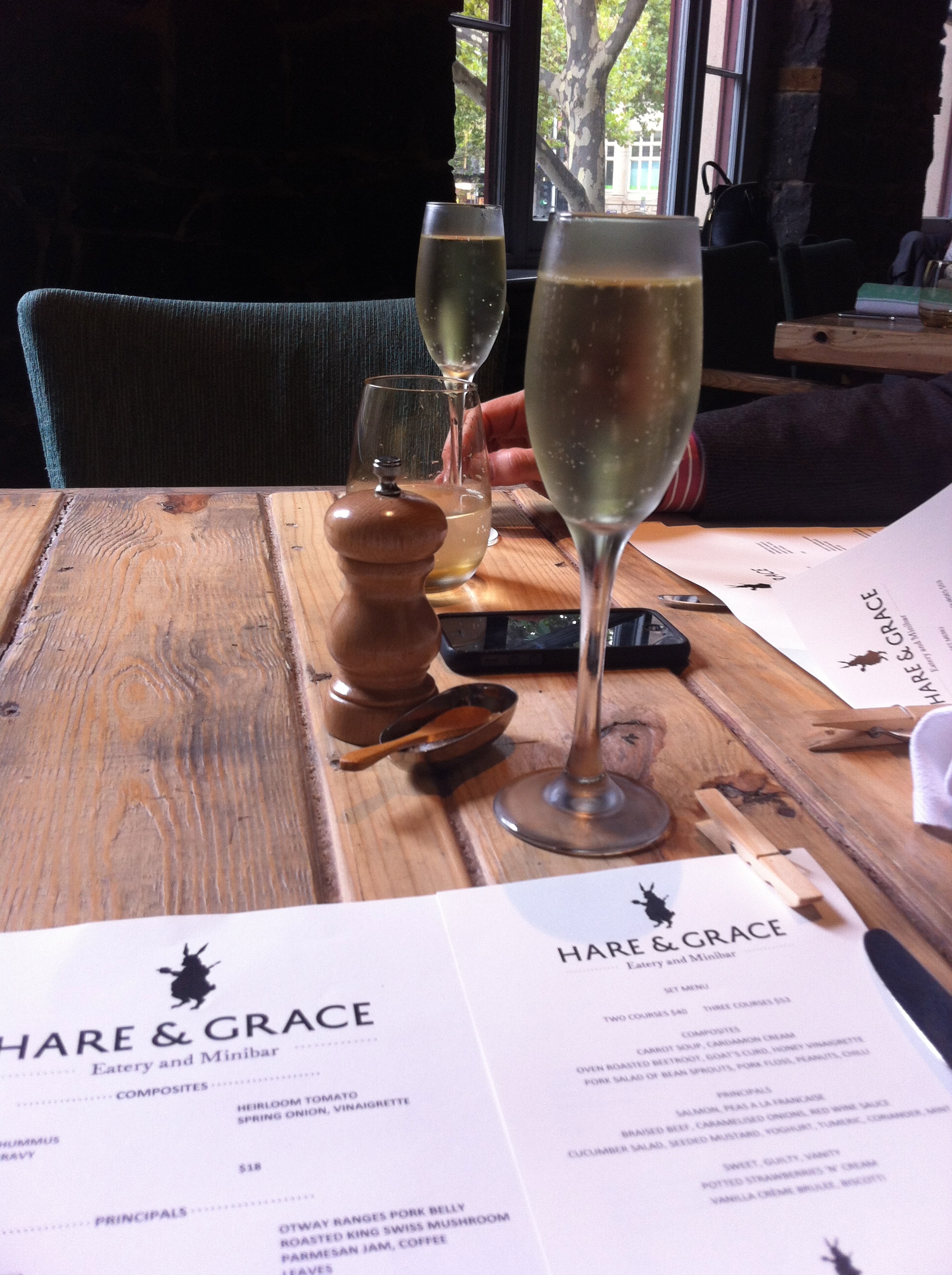 Choosing to skip breakfast entirely (a waste of good stomach space) I jumped on a tram and met my Dad in the city for lunch. We went to Hare and Grace, on the corner of Collins and King. Dad somehow knows the chef (from many long liquid lunches I suspect…) who sent over some Champagne to start with. Athankyou.