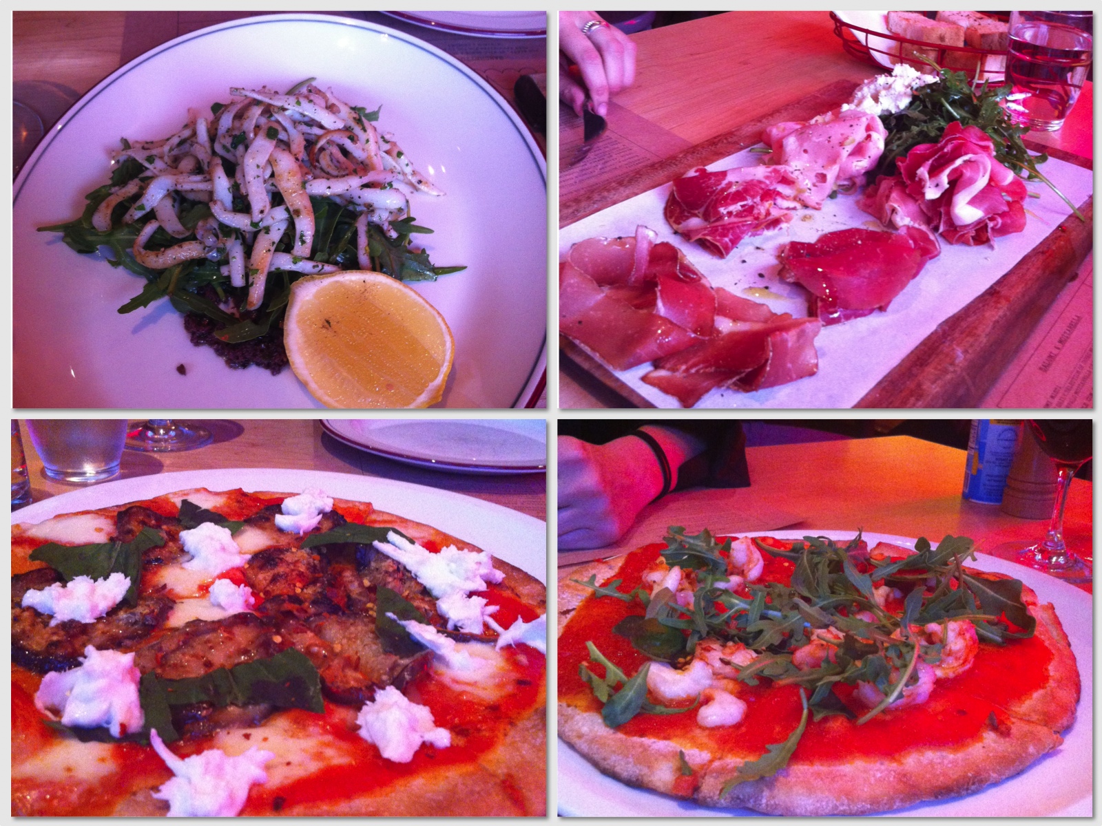 We had calamari and cured meats to start, followed by three (gluten free!) pizzas. One had prawns, another had eggplant, basil and cheese and the other one had salami (can you tell I’m just guessing from the photos? I did mention there was a lot of wine).
