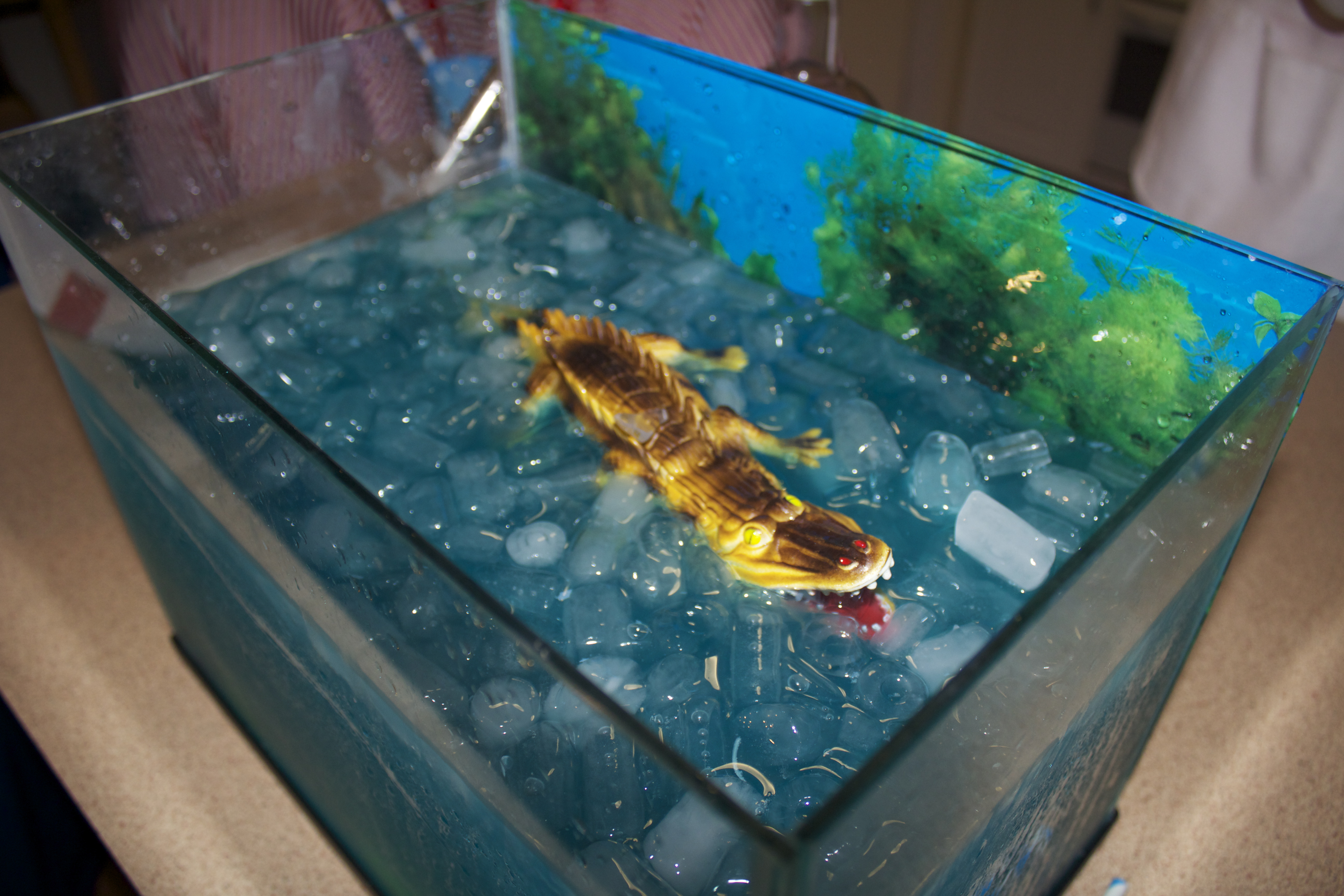 Fish tank punch. Another of Jo’s genius ideas. The fish tank was brand new, Bec whipped up a delicious blue concoction and the croc just dove in.
