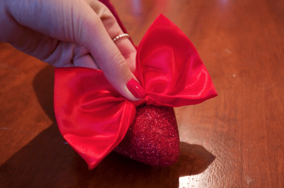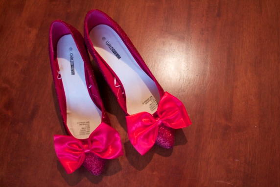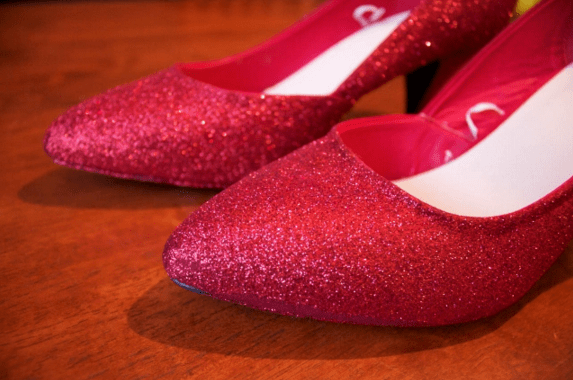 I bought a pair of red heels from Kmart for $15, painted them with PVA glue and dusted them with red glitter. It was a messy process, but the result was great: