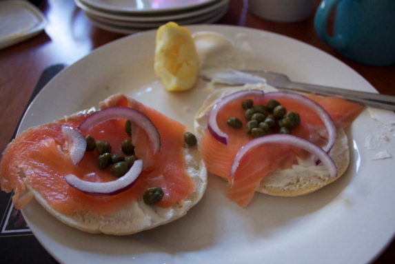 I have a bit of a birthday tradition of having bagels, smoked salmon, cream cheese and capers for breakfast. Unfortunately I couldn’t find bagels but a friend of mine found ‘bagel thins’ which were a fine substitute.