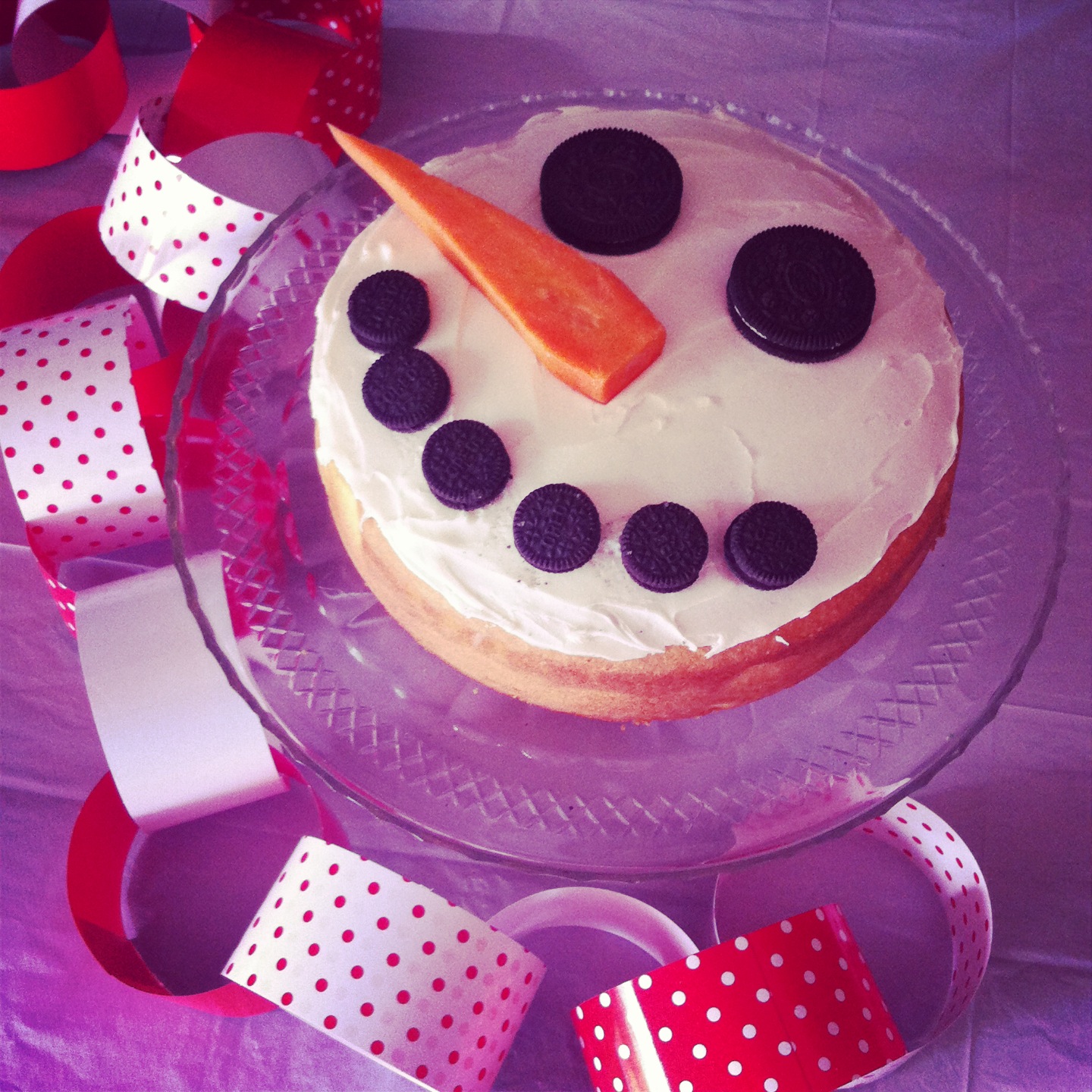I baked a snow man cake with a little help from Betty Crocker (I was feeling pretty lazy), some Oreos and a carrot. Looks pretty cute right?