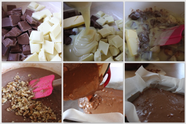 Anyway, seeing as I have a history of blogging disasters I thought I would press on and post a how to recipe in reverse. All that is in the recipe is about 400g of chocolate (some obviously gets lost in the preparation), a tin of condensed milk and 30g of butter. I also threw in some chopped walnuts for luck.