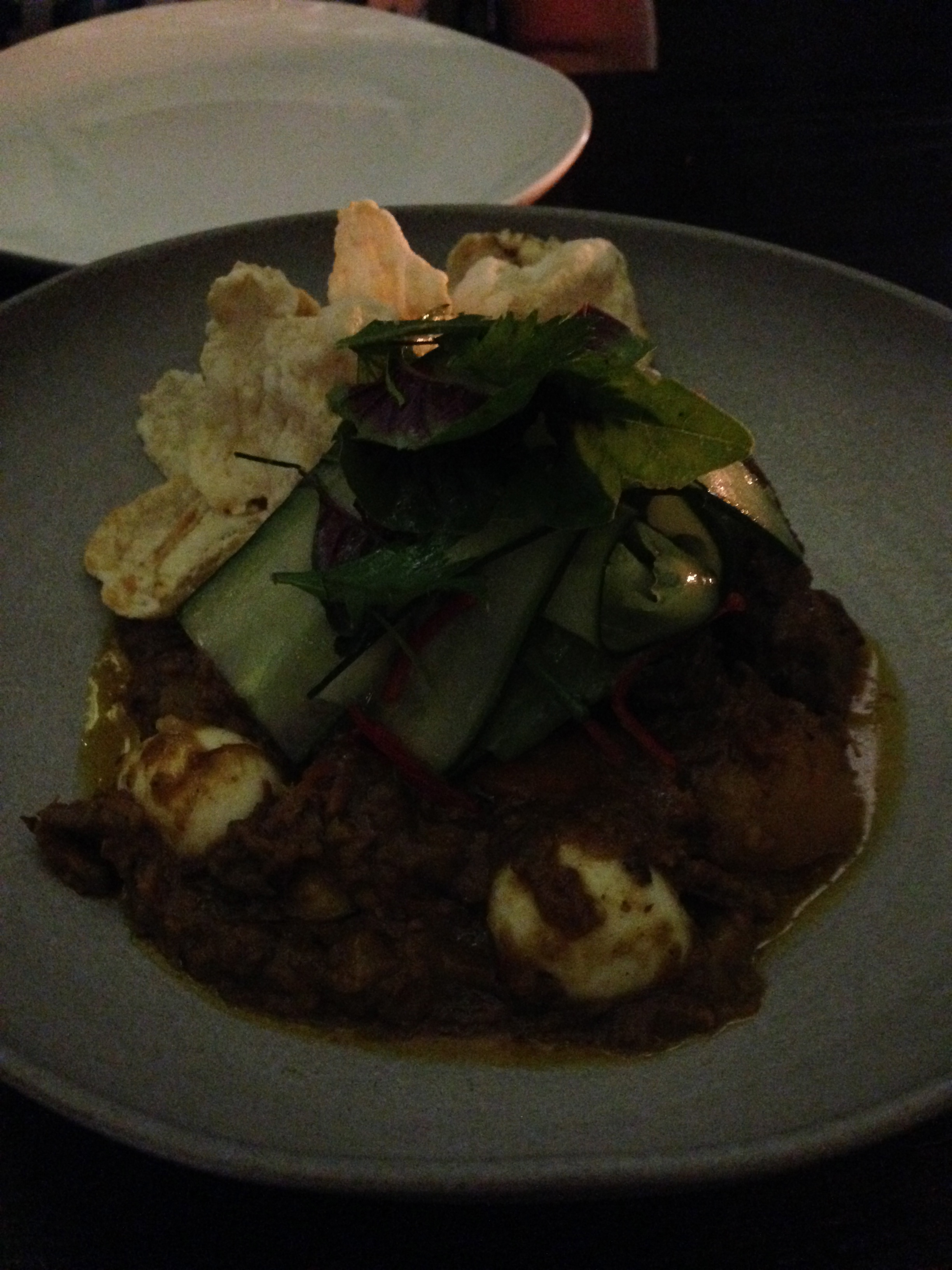 As well as crispy lobster slippers and amazing raw yellowfin tuna, which was plenty, we really didn’t need a main. But we got one! Balinese Wagyu beef curry with potato chilli and quail eggs: