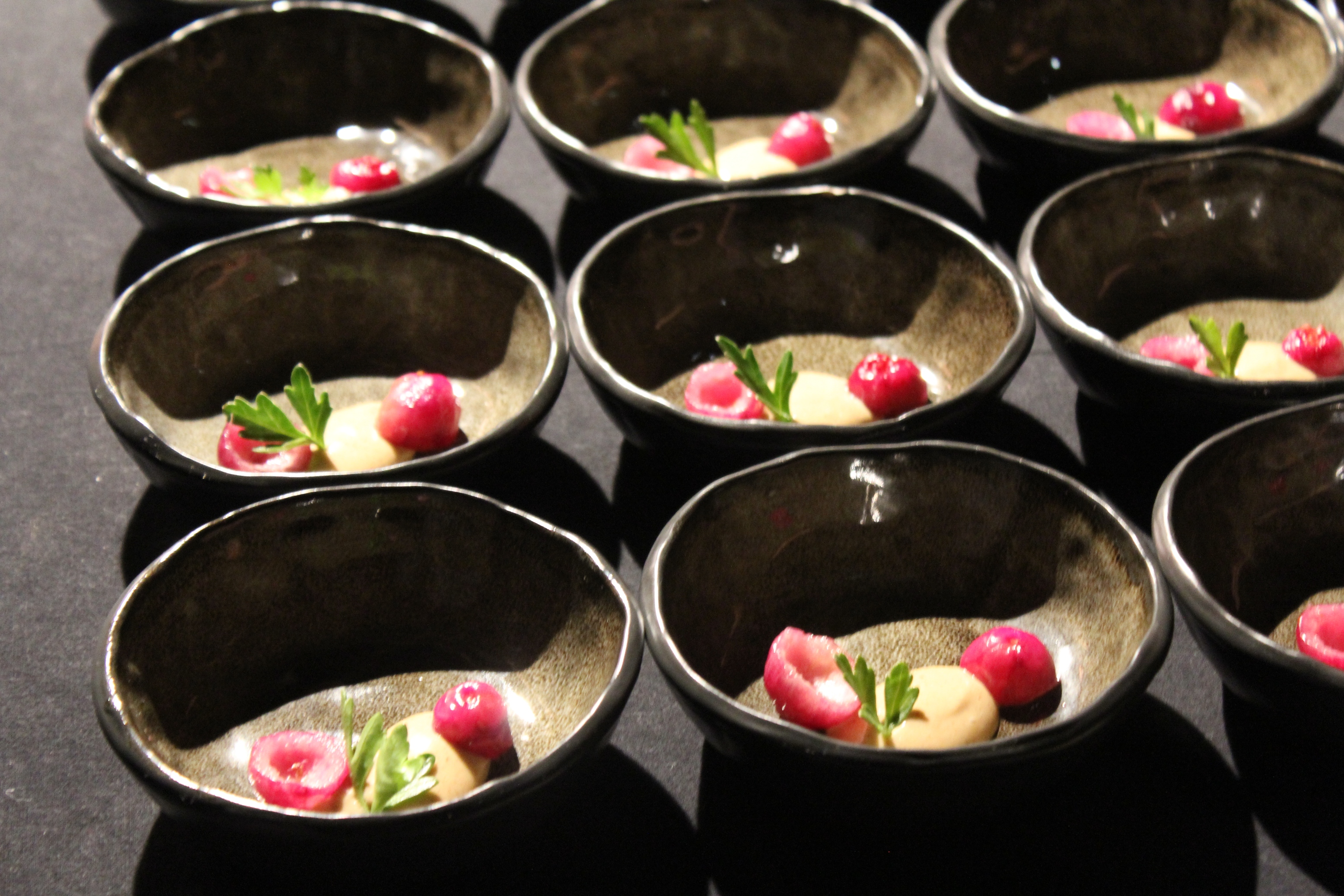 We started with raw Esperance scallop, fermented riberries and juice with sea celery oil: