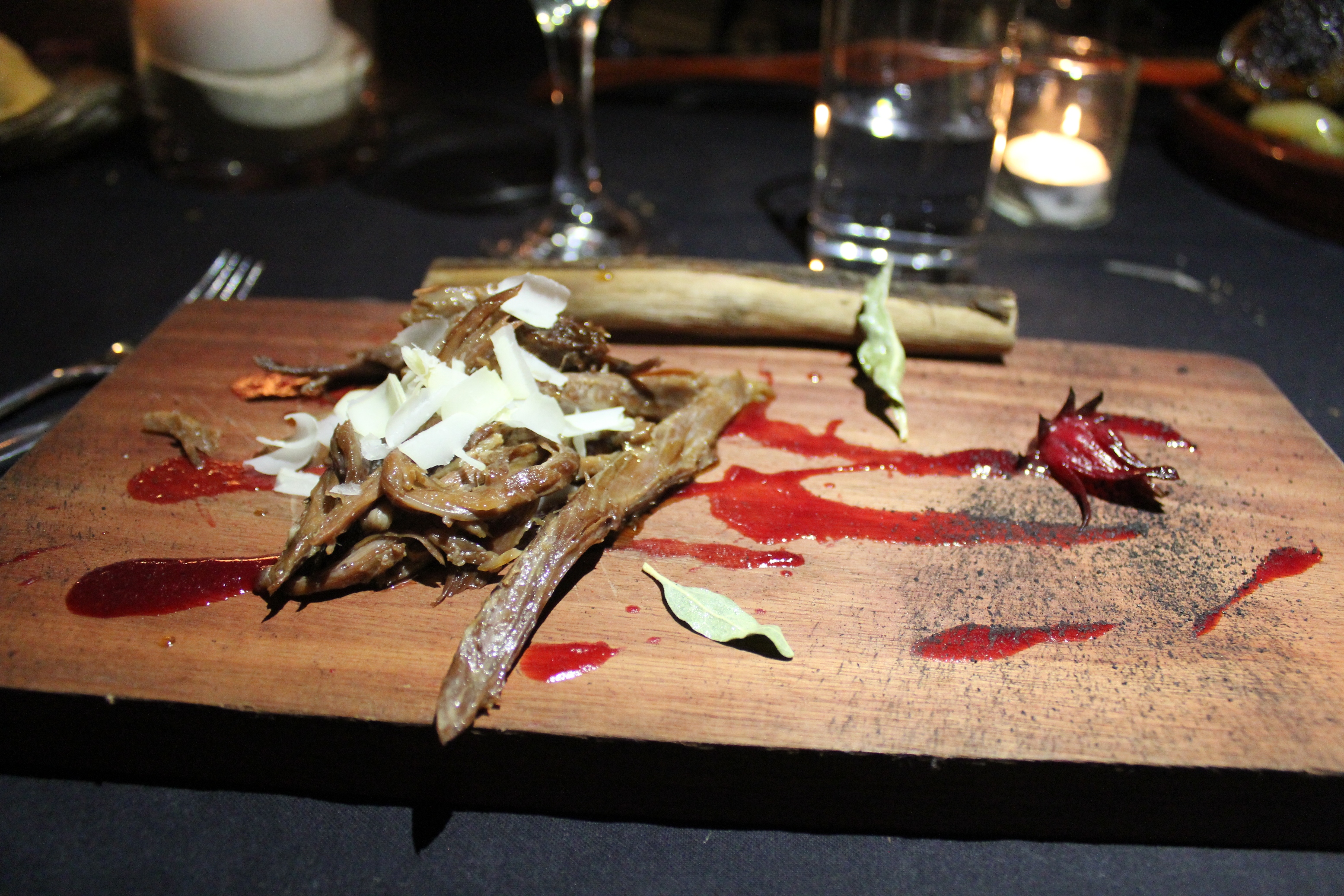 The main course (is there a ‘main course’ in a degustation dinner?!) was kangaroo tail with wild rosella puree, red gum ash, macadamias and crispy salt bush leaves: