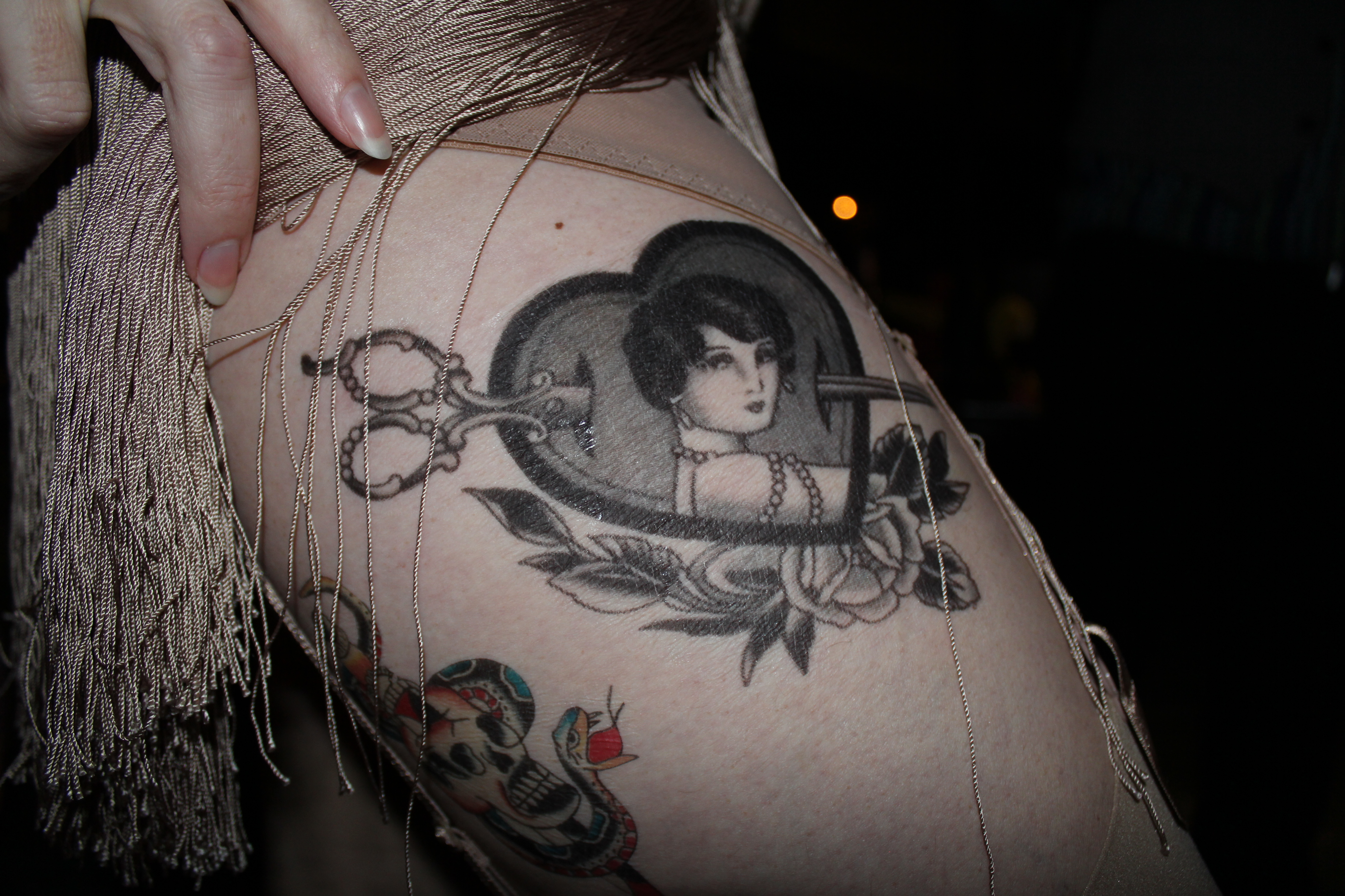 Ellenmary, a bear tamer, decked herself out with amazing vintage tattoos that she printed and applied herself:
