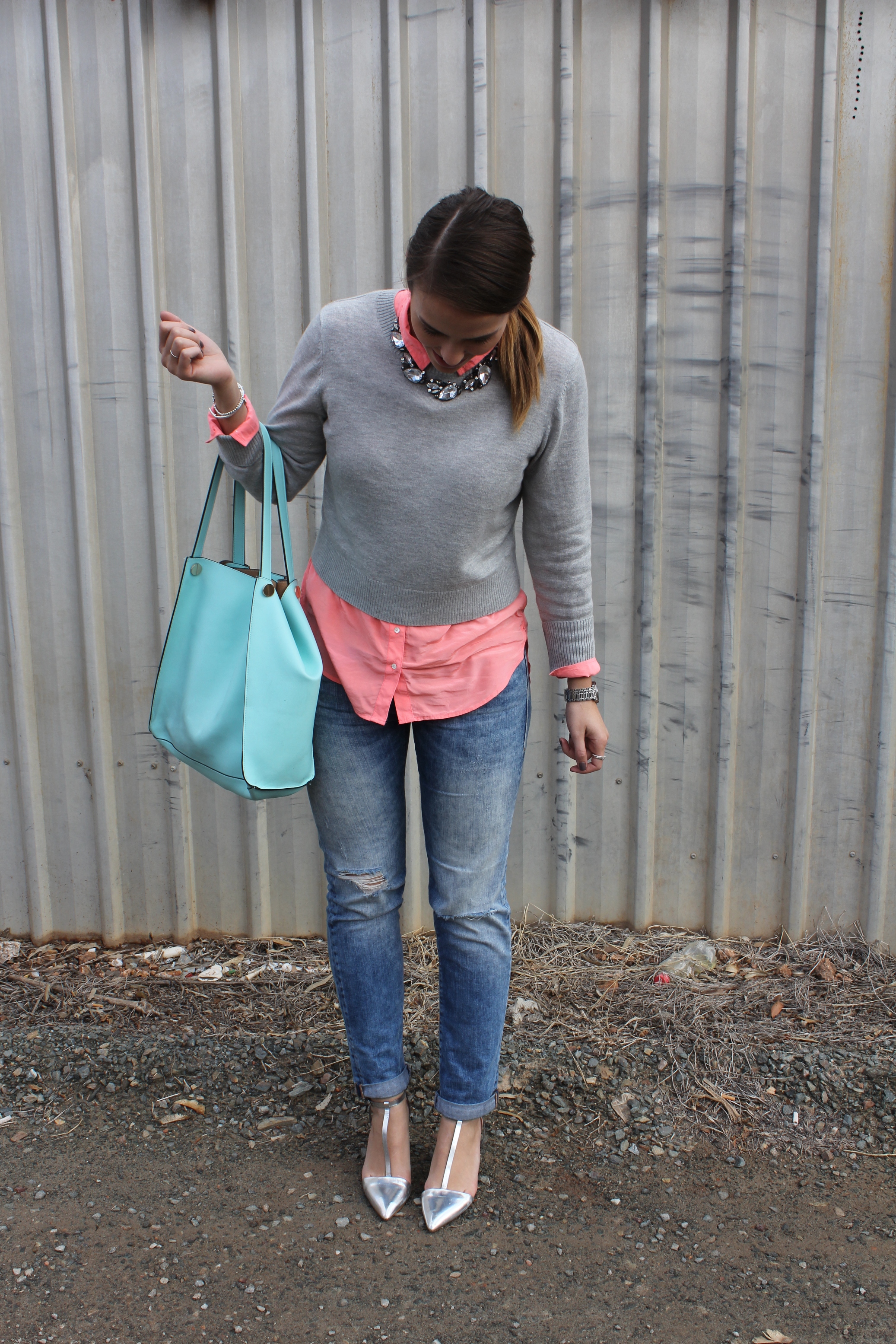 I got the idea for this outfit from Pinterest, I just searched ‘grey sweater’ and arrived here. That photo reminded me that I too, own a brightly coloured shirt. Pinterest is great like that. If you ever need ideas on how to wear certain items just do a Pinterest search and voila! A million options. Pinterest is dangerous though because it’s full of delicious foods and links to beautiful expensive things, so be careful.