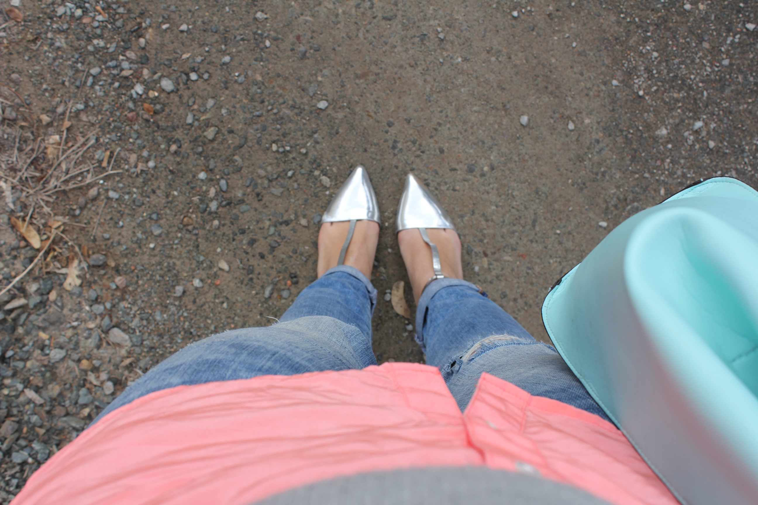 I’m wearing a Country Road shirt bequeathed to me by my friend Claire, a cropped sweater from Sportsgirl, Mavi Jeans, Zara shoes, a really old necklace and that’s a Target handbag hanging WAG style from my forearm.