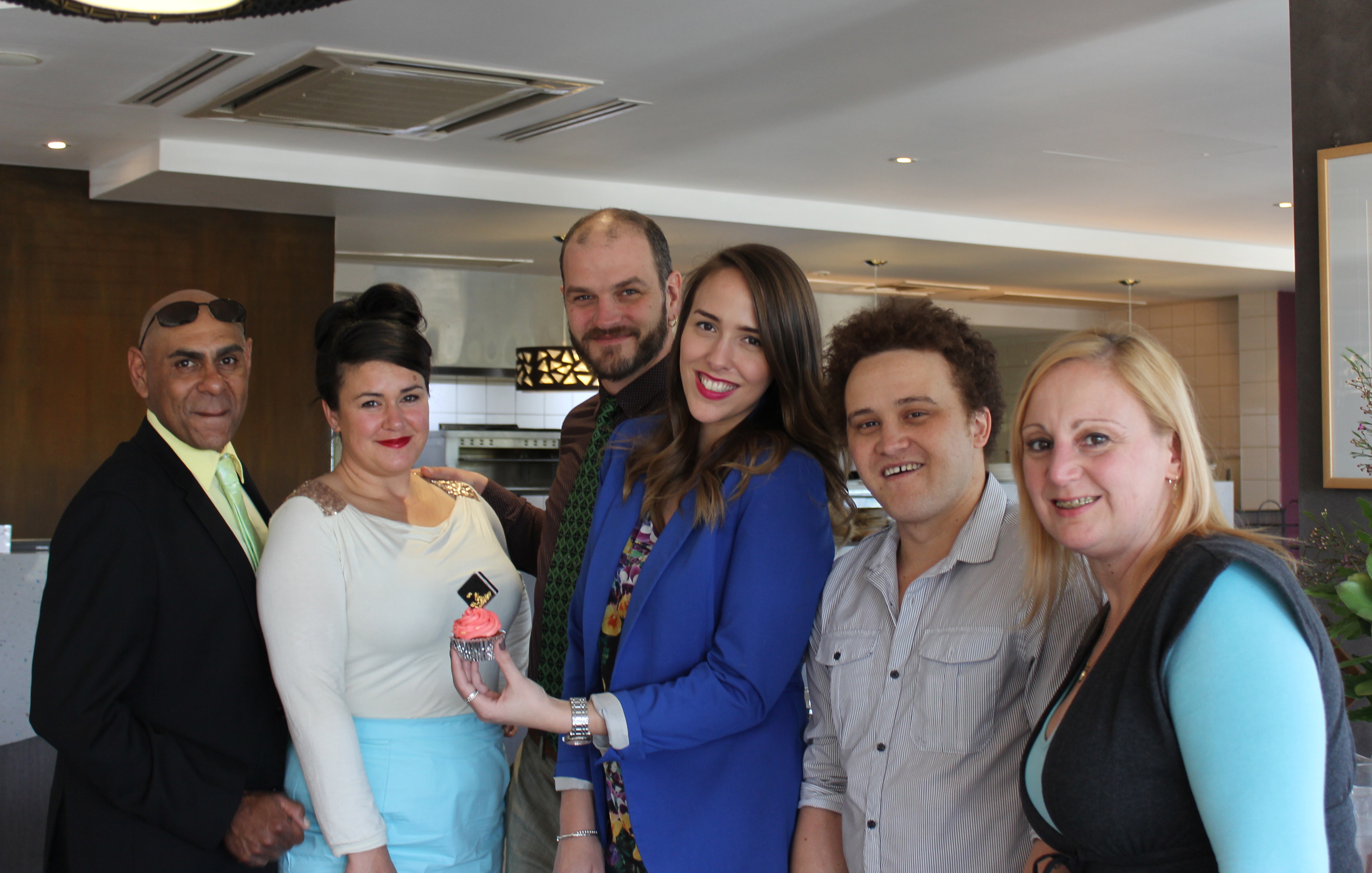 The Kalgoorlie-based team members from left to right: First Nations Creative Producer Gary Cooper, Chair of Country Arts WA Kate Fielding, Artistic Direction Ben Fox, me awkwardly holding the cupcake, Creative Producer Owen Hinton and Lisa Van Oyen: