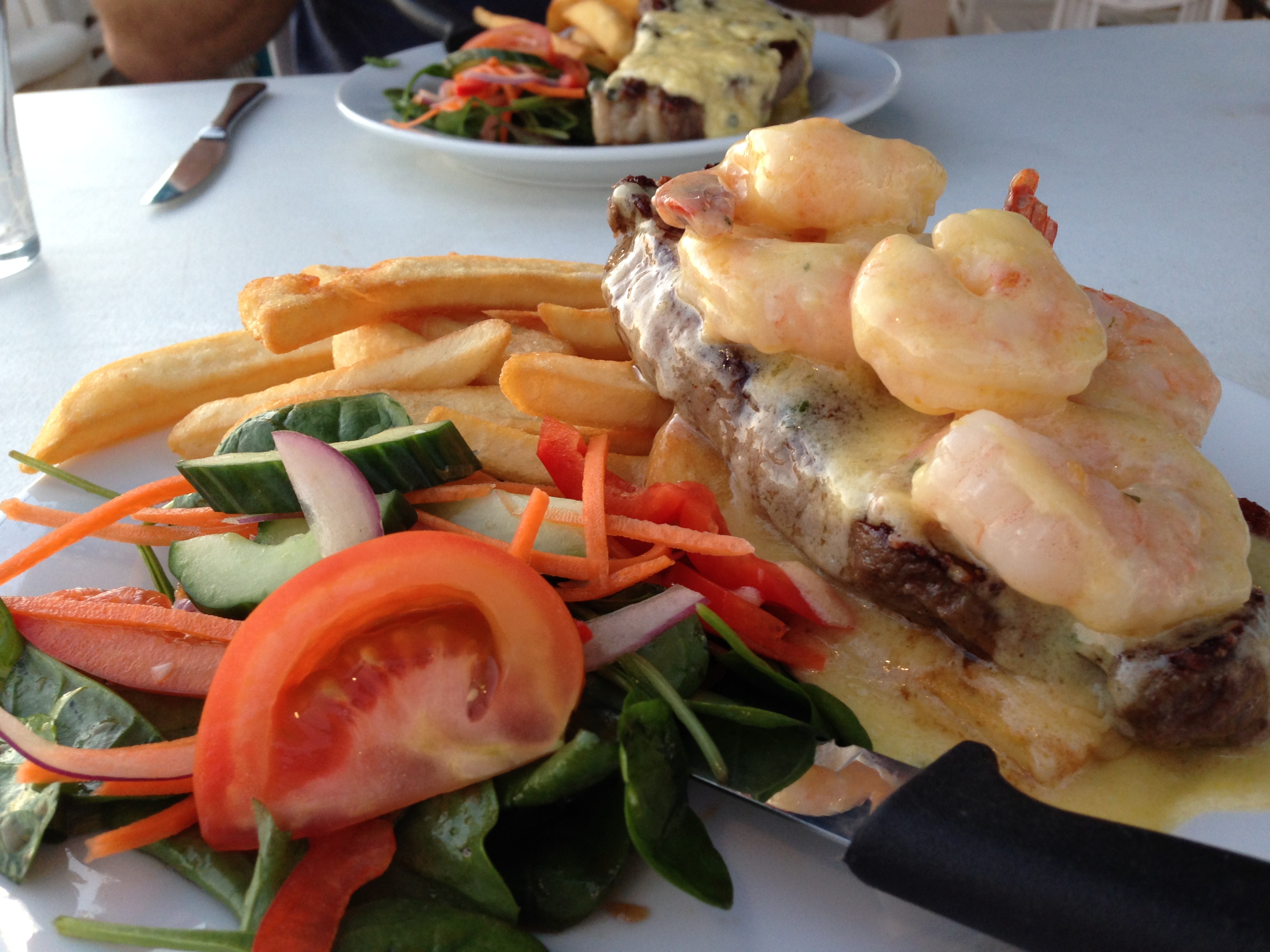 It was also steak night, so I ordered the meal I’ve always wanted to order but never had; surf and turf. Which is steak topped with prawns.