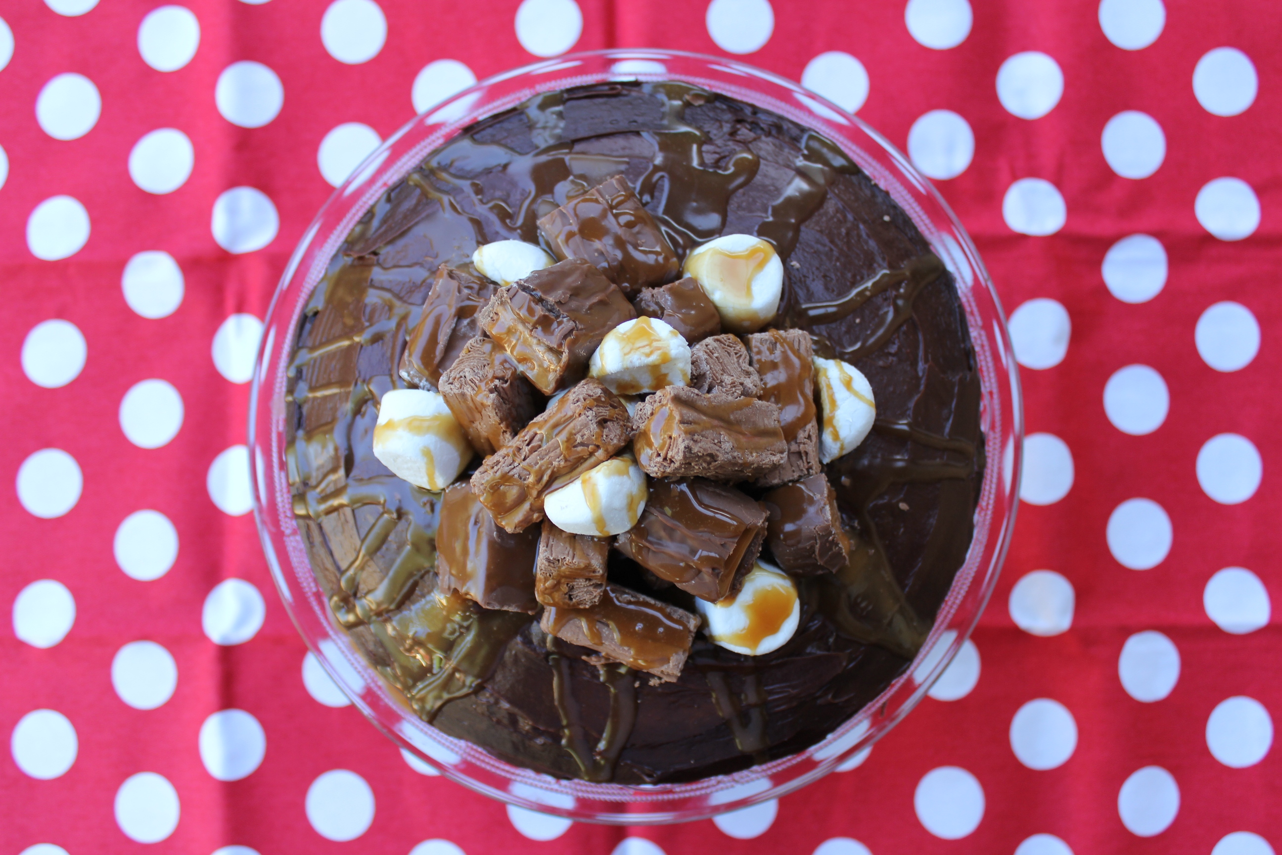 This is a really easy way to make any cake look good ridiculously indulgent and over the top. It comes from this recipe for caramel rocky road cake , which looks amazing, but who has time to bake four cakes?! I wanted an impressive looking cake for my friend Emily’s birthday last week, so I took the rocky road cake topping from the link above and added it to a mud cake.