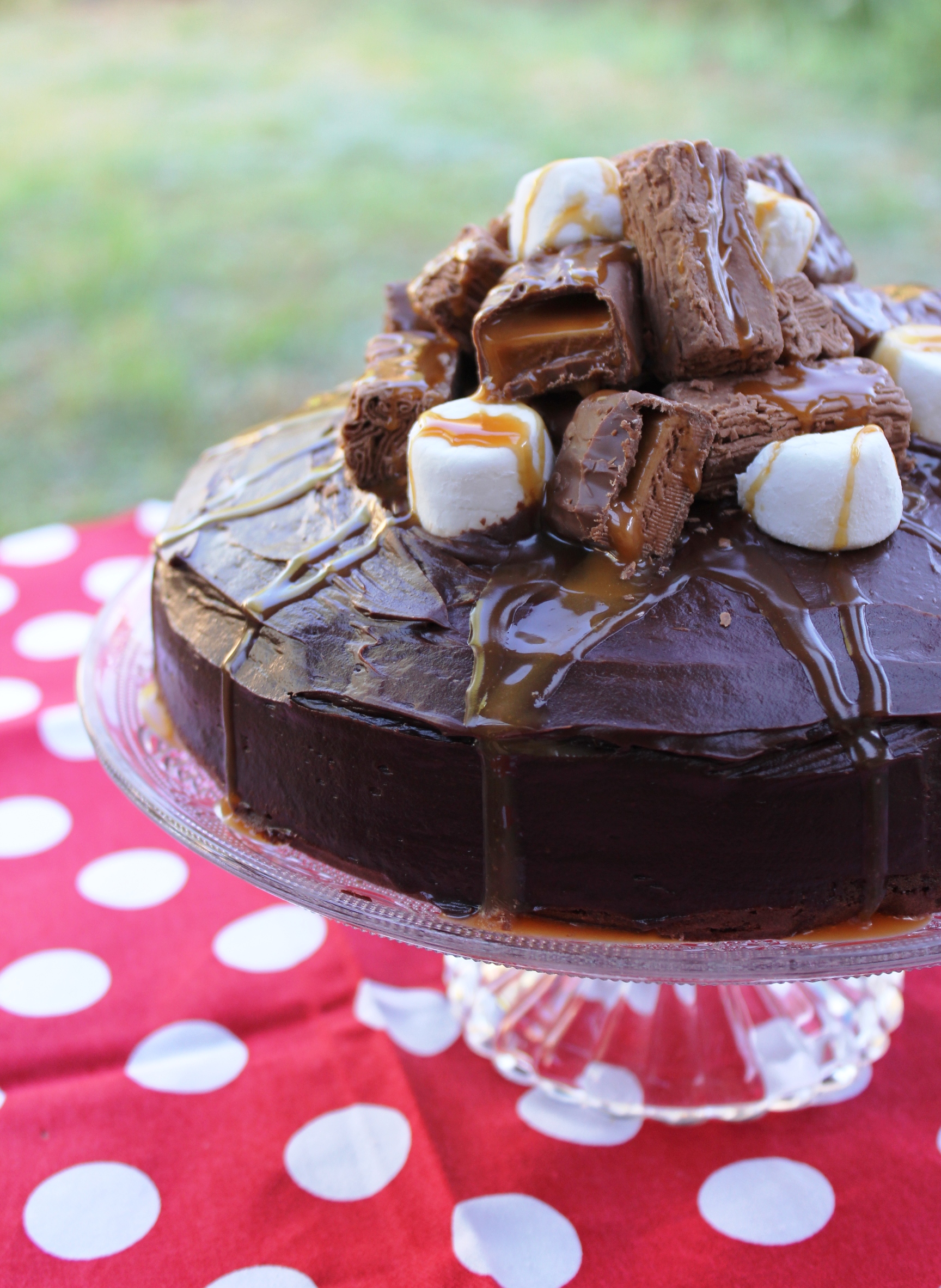 All I did was arrange mini flake bars, mars bars and marshmallows on the cake before drizzling (store bought) salted caramel sauce all over the chocolate mountain. I made it on Thursday night, covered it and when I lifted the cover off on Friday morning the smell of caramel literally smacked me in the face. It was aaaaaamazing.