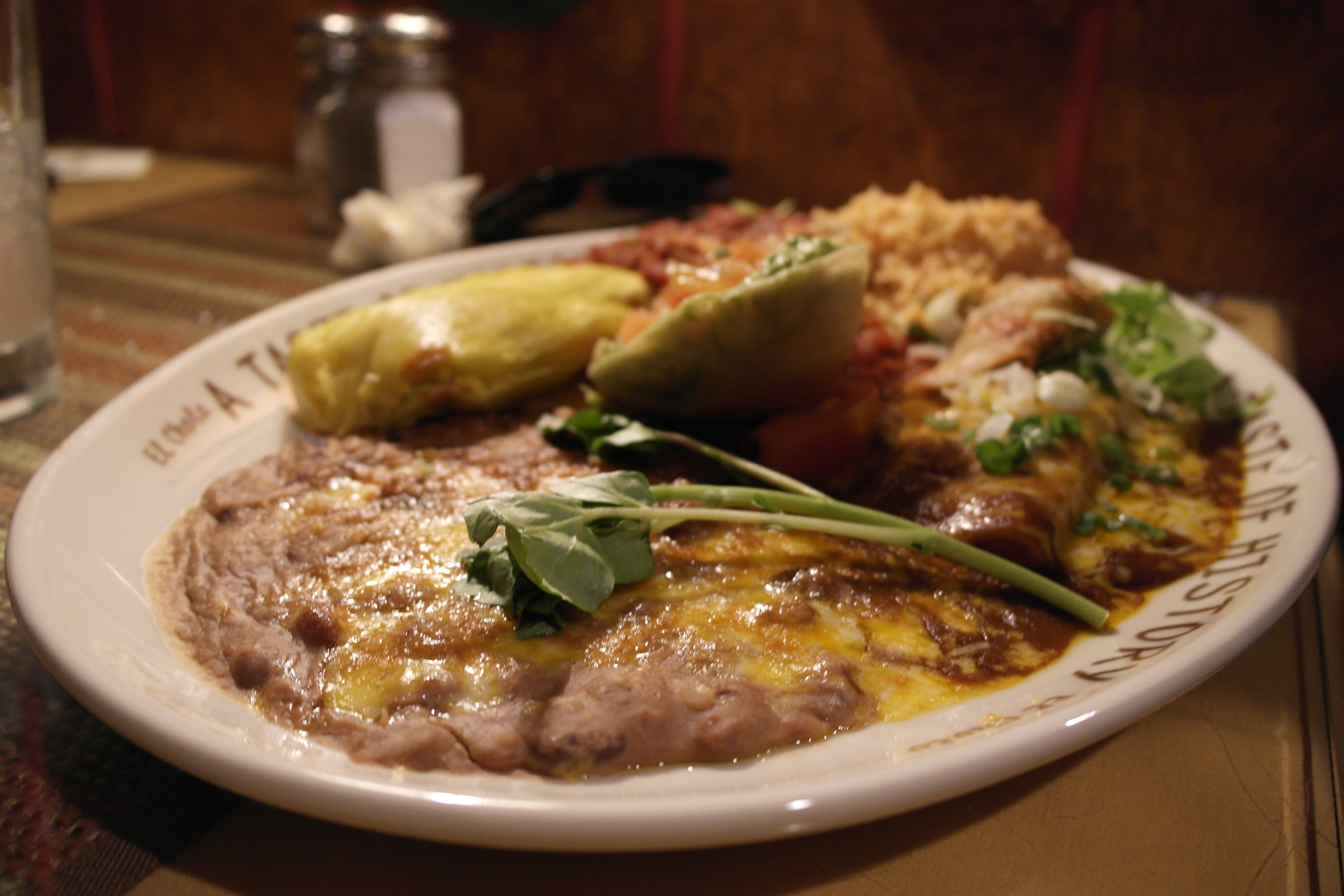 Andrew had ‘A taste of history’, which included a cheese enchilada, rolled beef taco, chile relleno, green corn tamal, spanish rice and refried beans: