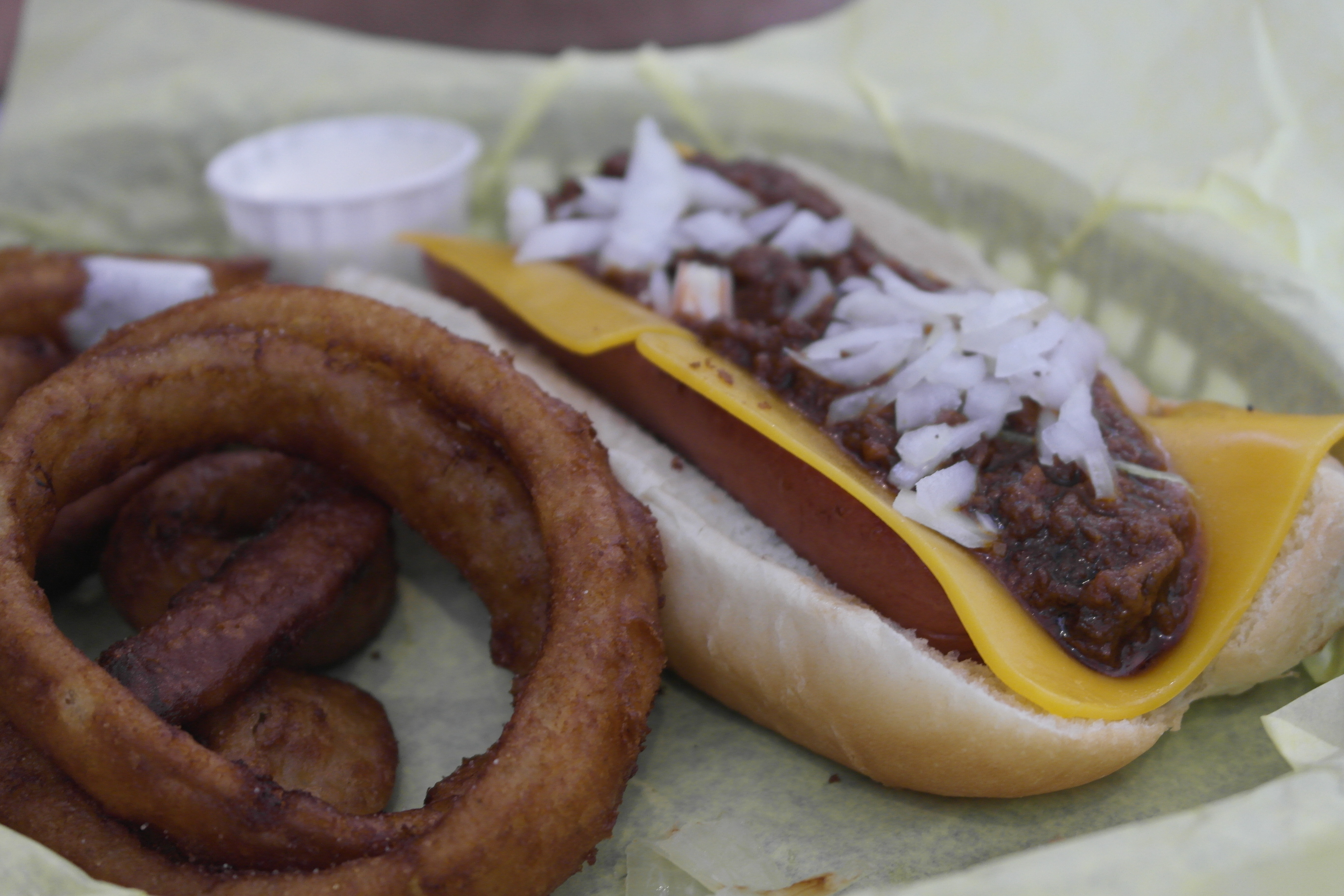 We grabbed lunch at Norton’s Pastrami & Deli, as suggested by Andrew’s uncle Eric. We were not disappointed. Andrew had the chilli dog with a side of onion rings that we shared: