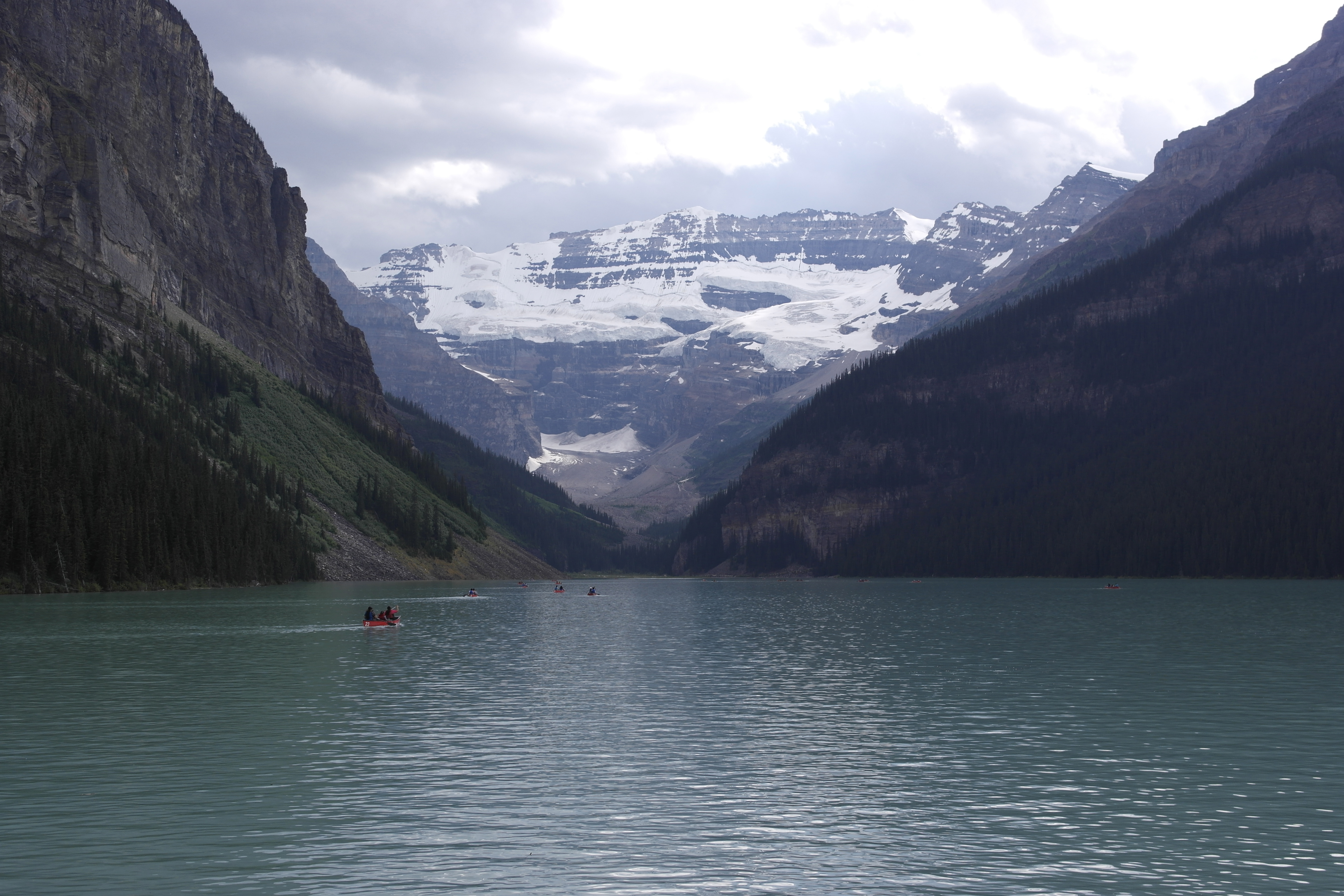 We arrived at Lake Louise in the late afternoon and battled ginormous buses groaning with tourists for a parking spot. We dodged errant selfie sticks, flailing in the air, as we jostled for a view of the famous lake beneath an angry grey sky.