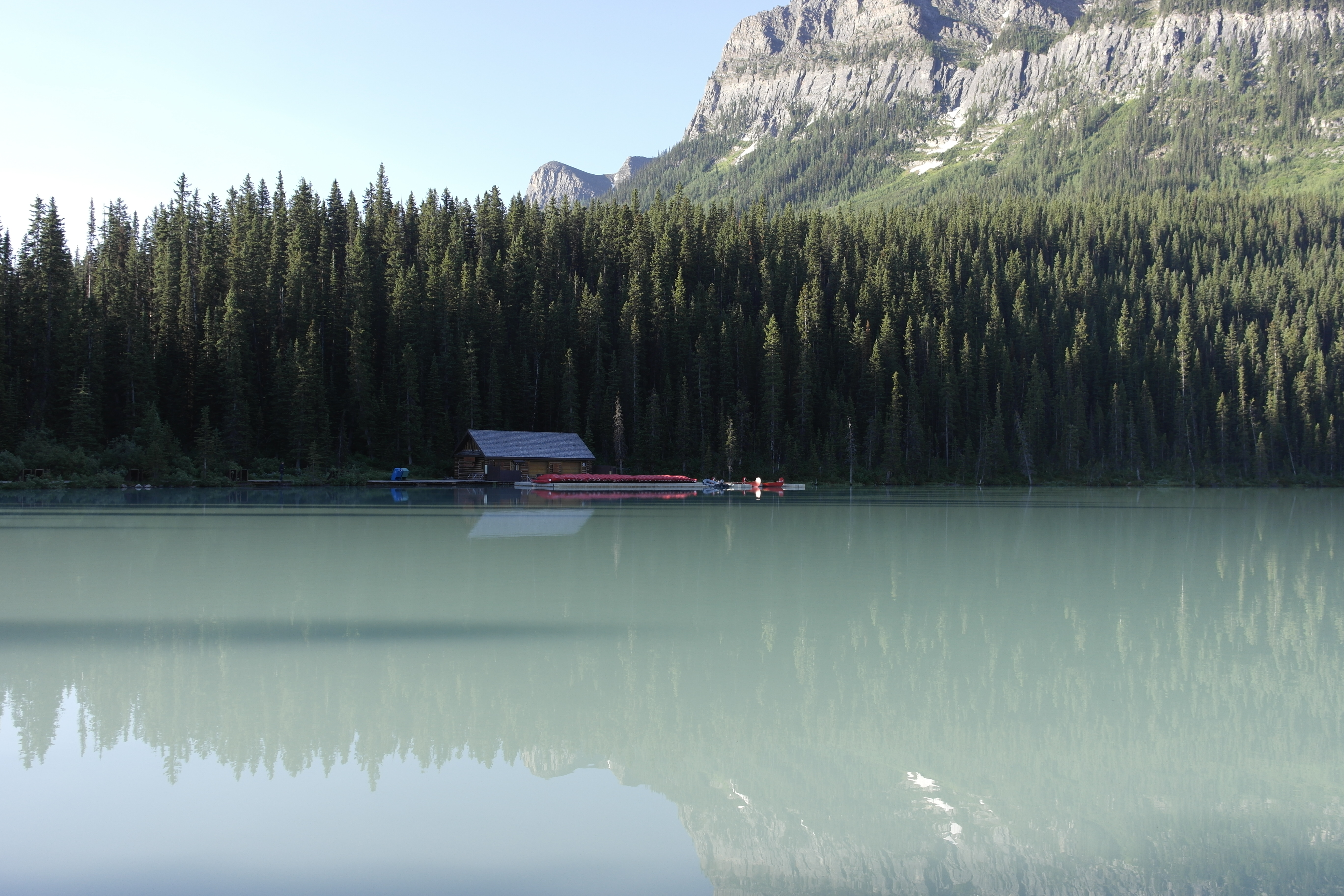 Love the contrast of the lake water with the red canoes