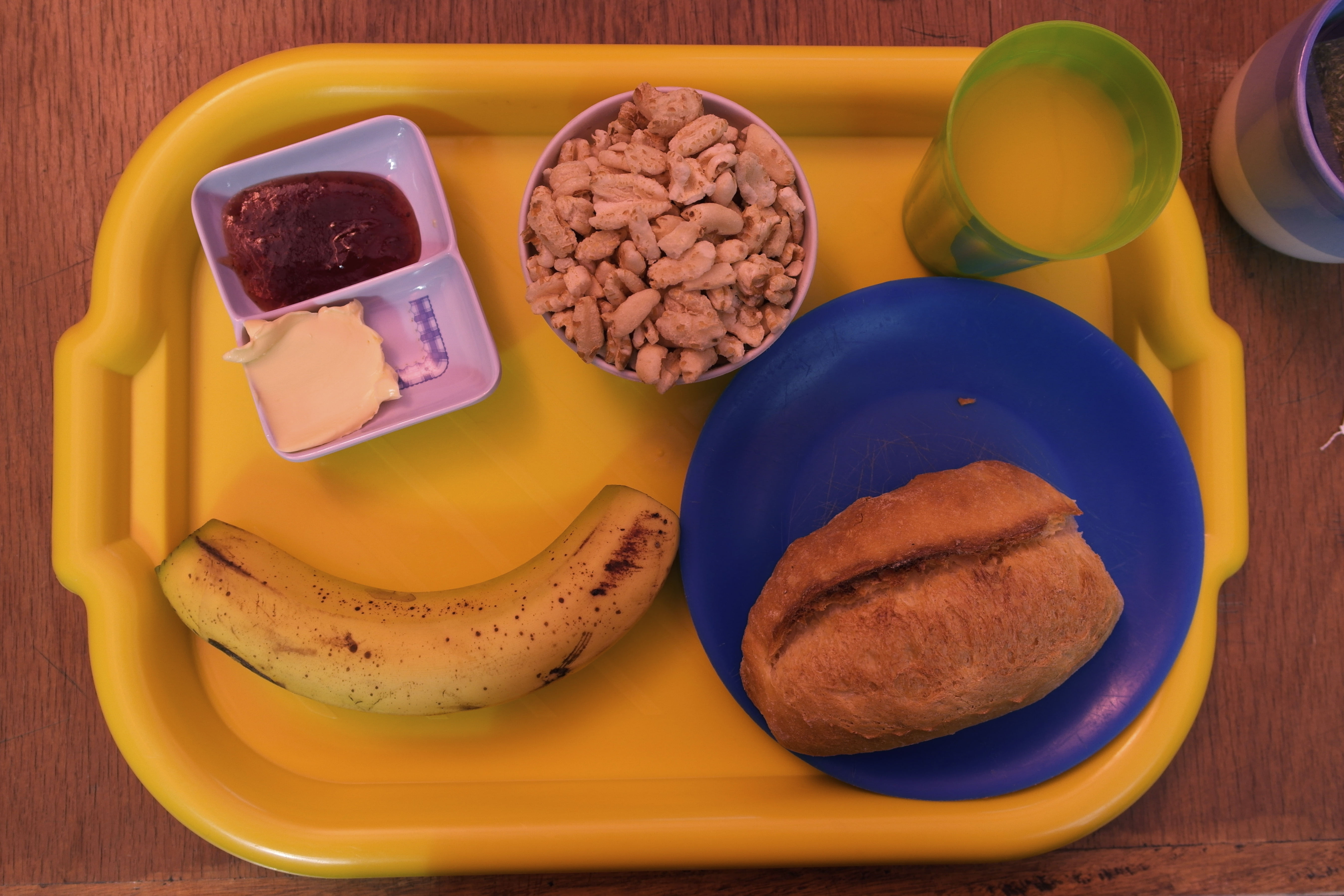Love that it looks like a school cafeteria meal! Cereal, juice, bread, a banana and jam and butter