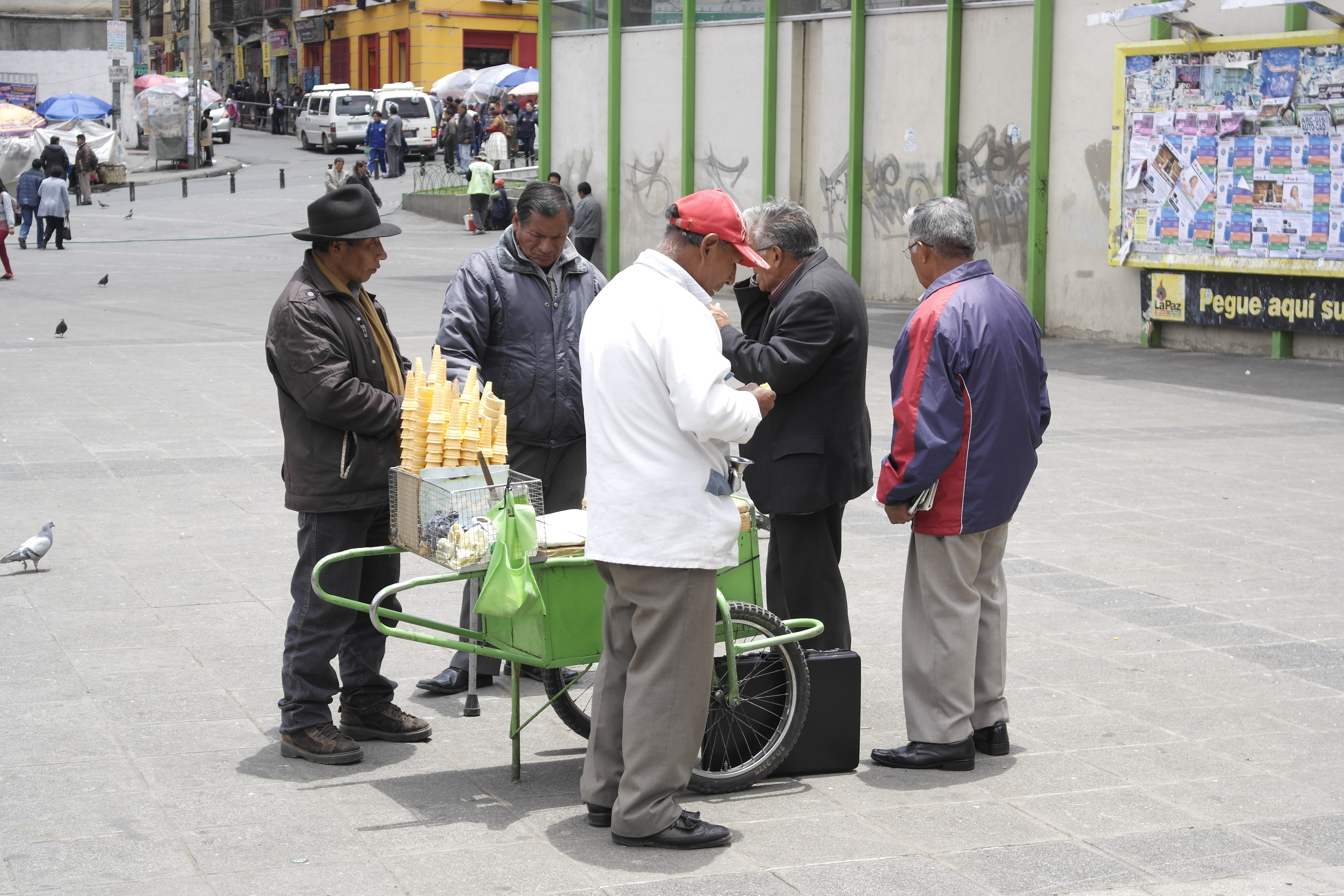 La Paz is utter mayhem. Throngs of people darting along skinny pavements dodging noisy cars, market stalls, buses, pollution and dogs everywhere. Oh and food. There are street vendors every few steps selling everything from ice cream, jellies, juices, curious drinks that come in plastic bags, to burgers, hot dogs and chewing gum.