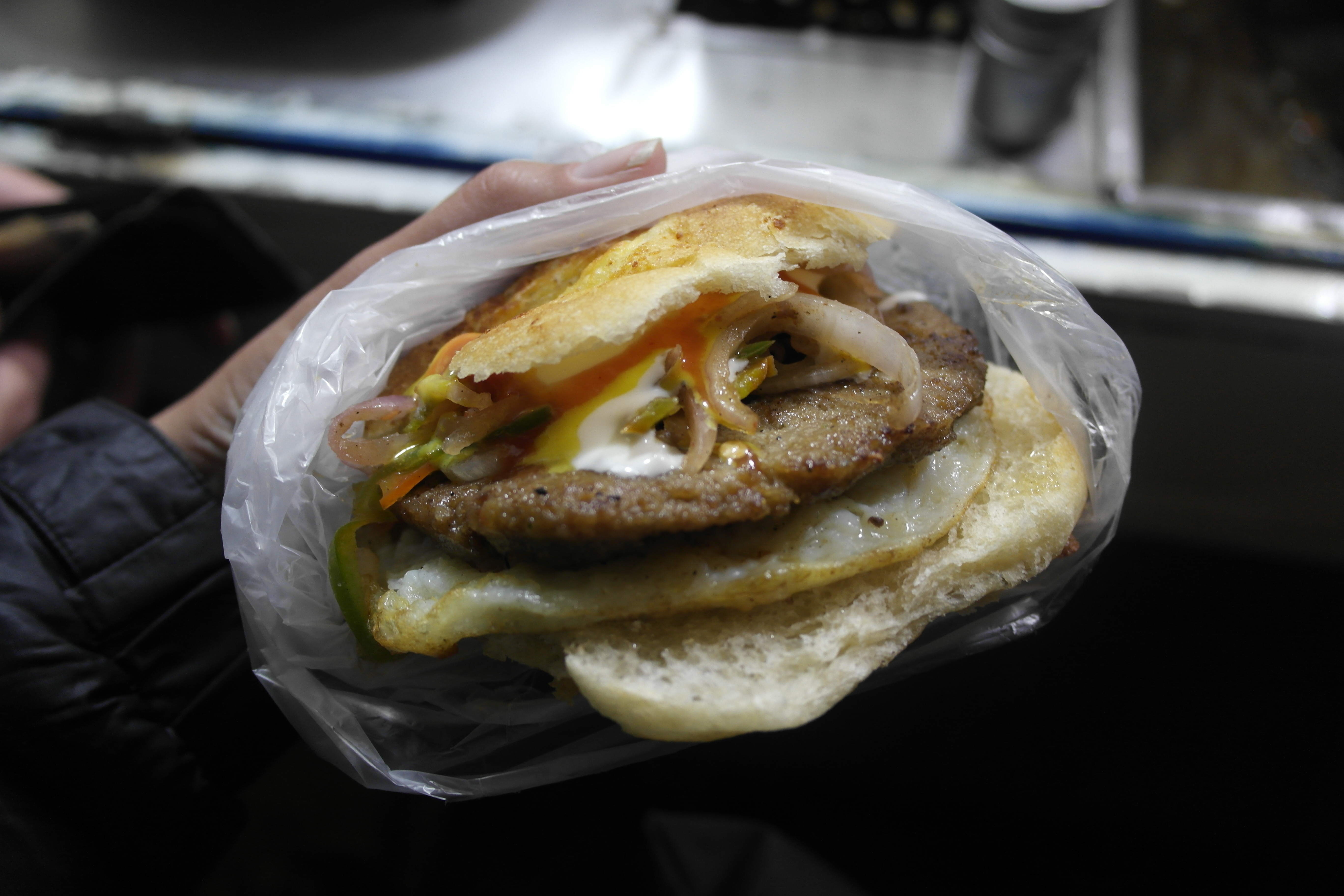 The other common street food is burgers, with or without a meat patty, an egg, some fried veggies and occasionally fries inside.