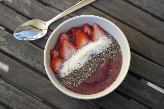- Have you read the old folk story Stone Soup? It’s the one where these travellers show up in a village and convince the locals they can make a soup for everyone using just a pot and a stone… Oh and a few your carrots… And maybe some spices… Etc etc until basically they trick the villagers into giving them all the ingredients. Well making your own acai bowl is a bit like that. You blend a frozen banana, half a cup of frozen blueberries, some coconut water, oh and a teaspoon of acai powder and bam! You have acai! Well not really. I found my acai bowl tasted, unsurprisingly, of banana and blueberry.