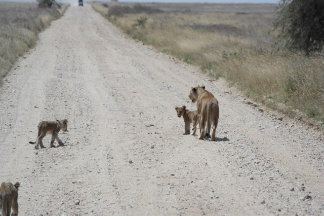 Unfortunately they got wind of her presence and sped off. We kept watching which is lucky because what happened next was delightful. She went to pick up the kids! Presumably in the spot she left them while she tried to organise dinner. The four of them then walked right past our Land Cruiser.