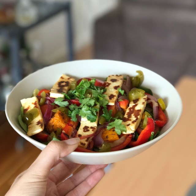 Slice the haloumi and fry in a non stick pan (use olive oil spray if you need) with the sliced onion and capsicum. Once the haloumi is browned and the onion and capsicum are soft add them to a bowl with the spinach, cooked pumpkin, jalapenos, coriander and whatever other veggies you like. Top with dressing if that’s how you roll (I like it without).