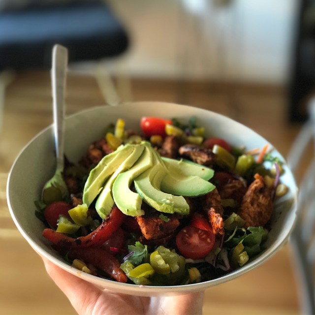 Cook the chicken and capsicum in the taco seasoning according to the instructions on the packet. Tip your desired amount of kale into a bowl, add chopped coriander, salt and lime juice to taste. Then add your corn and cherry tomatoes. Top the salad with the chicken, chopped jalapenos and avocado.